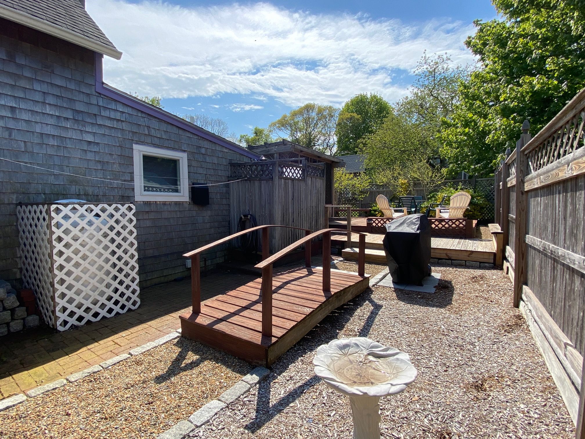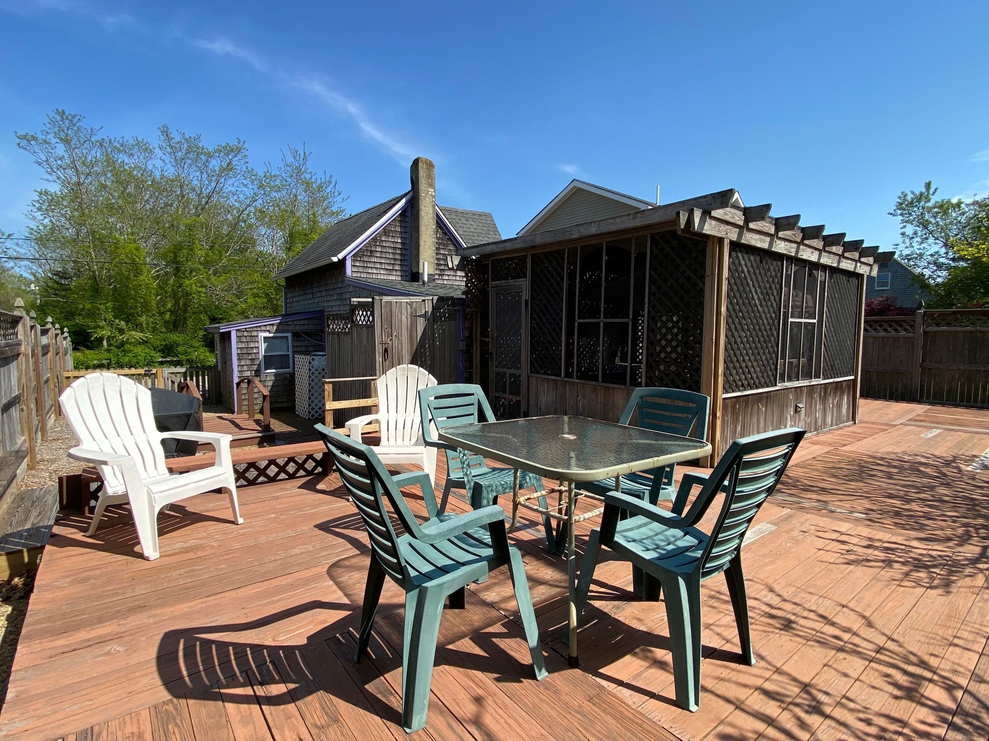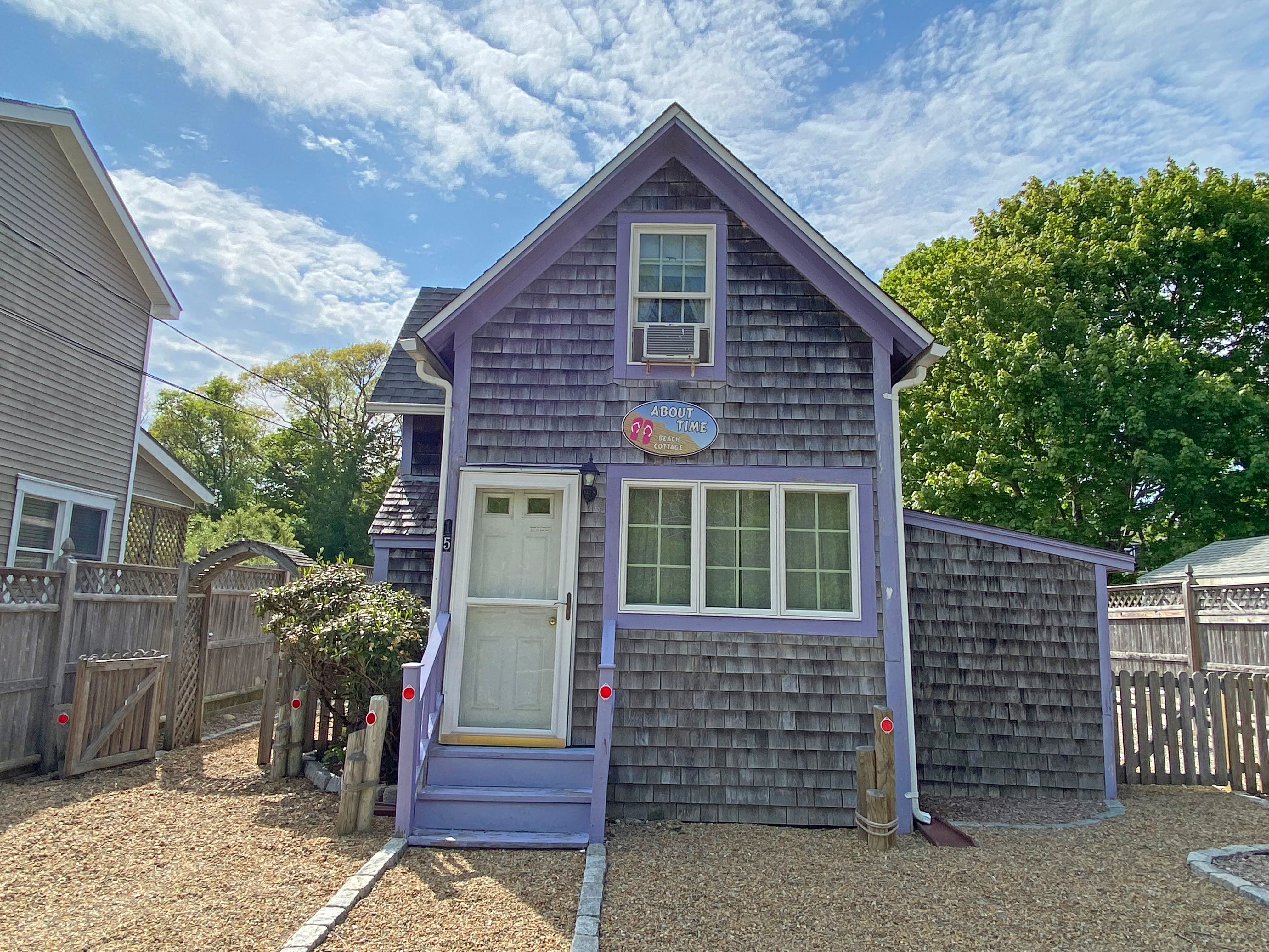 This sweet, little cottage is all about convenience. It is within walking distance to the center of Oak Bluffs and two town beaches. The interior of the cottage has recently been redone inside and is fresh & clean and perfect for a great vacation. Large decks, lovely gardens, large screened porch, enclosed outdoor shower, small kitchen, full bath, dining area, and two small 2nd floor bedrooms.