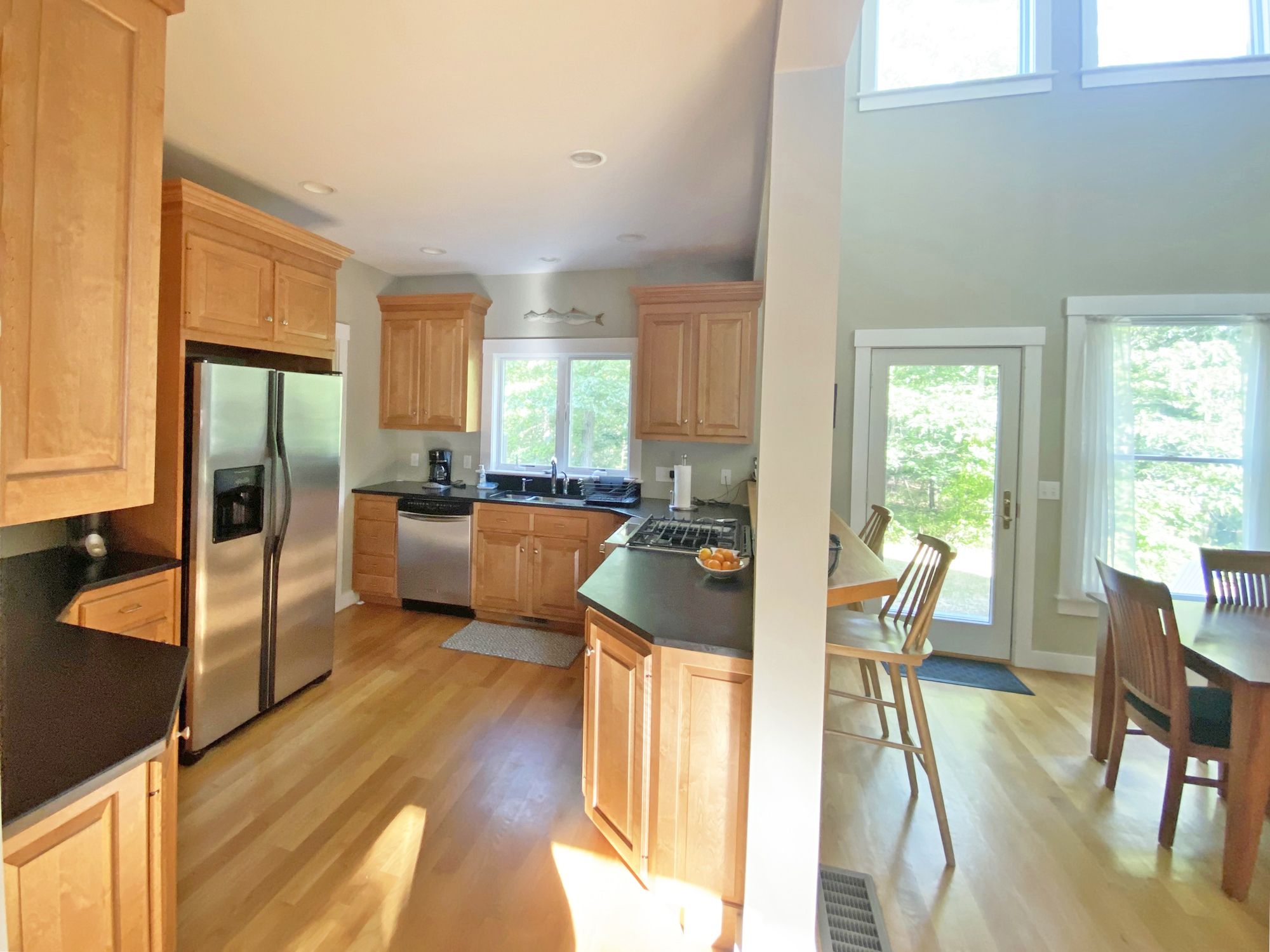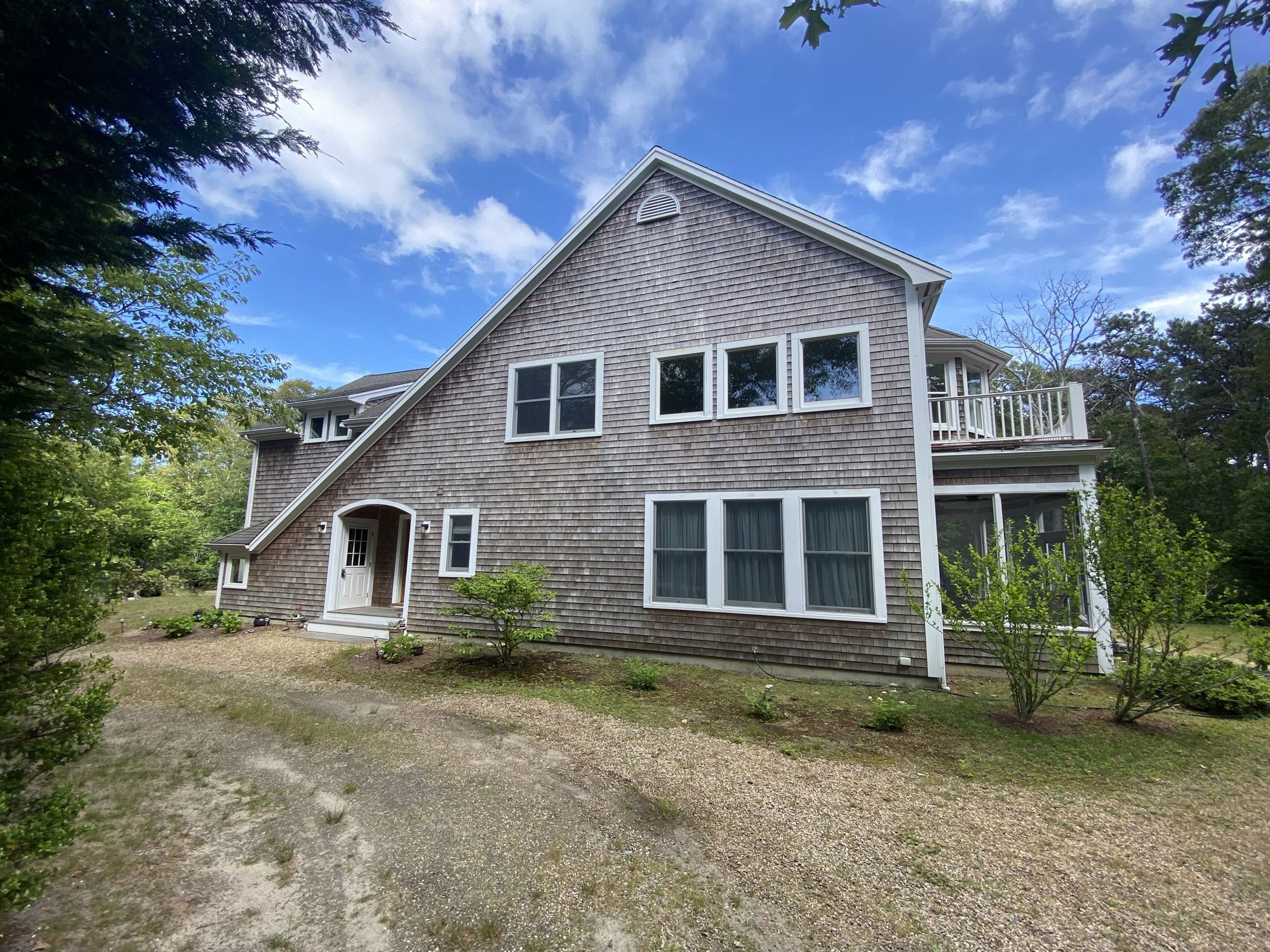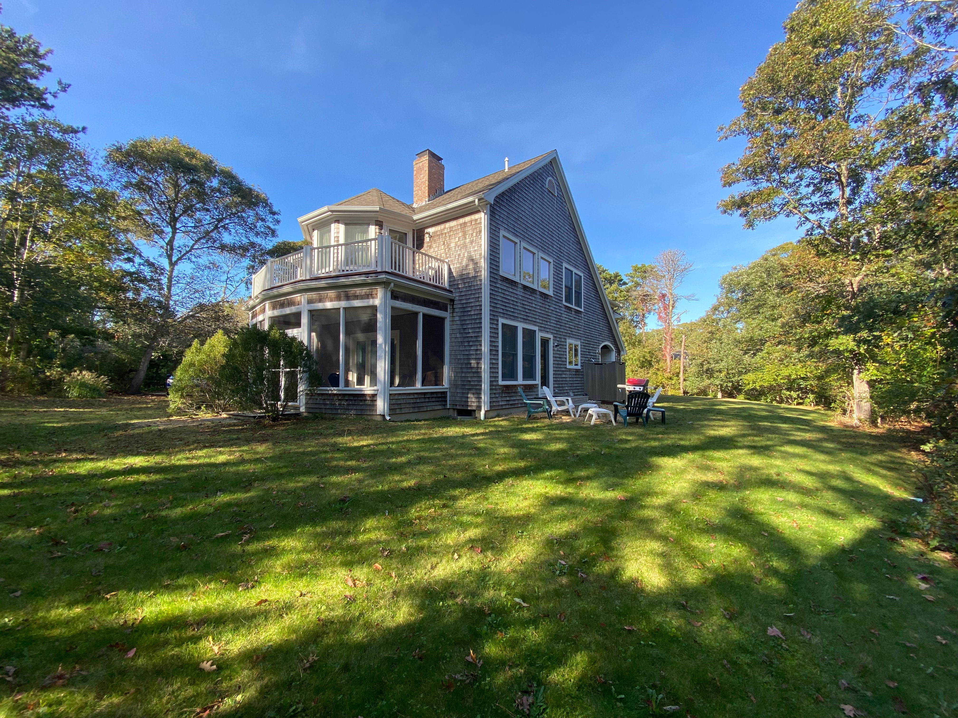 Nestled in the woods at the end of a cul-de-sac, this charming retreat offers an idyllic getaway for your summer vacation. Located a short stroll away from Oak Bluffs harbor (and a 10-minute drive to the town beach), this serene home is centrally located, while providing a quiet retreat, surrounded by lush greenery. The open-concept living area offers a cozy yet spacious atmosphere, ideal for gathering with family and friends. Large windows flood the space with natural light. There is a fully equipped kitchen with updated appliances and a grill outdoors, as well as a screened in porch to dine al fresco. The house comfortably sleeps 8. There is a master bedroom with an en suite bath on the first floor. The second floor consists of a second queen bedroom with en suite bath, along with two additional bedrooms (one with a full bed, and the other with 2 twin beds) that share a bathroom. Whether you're seeking relaxation, adventure, or a combination of both, this summer rental is the perfect haven to make lasting memories.