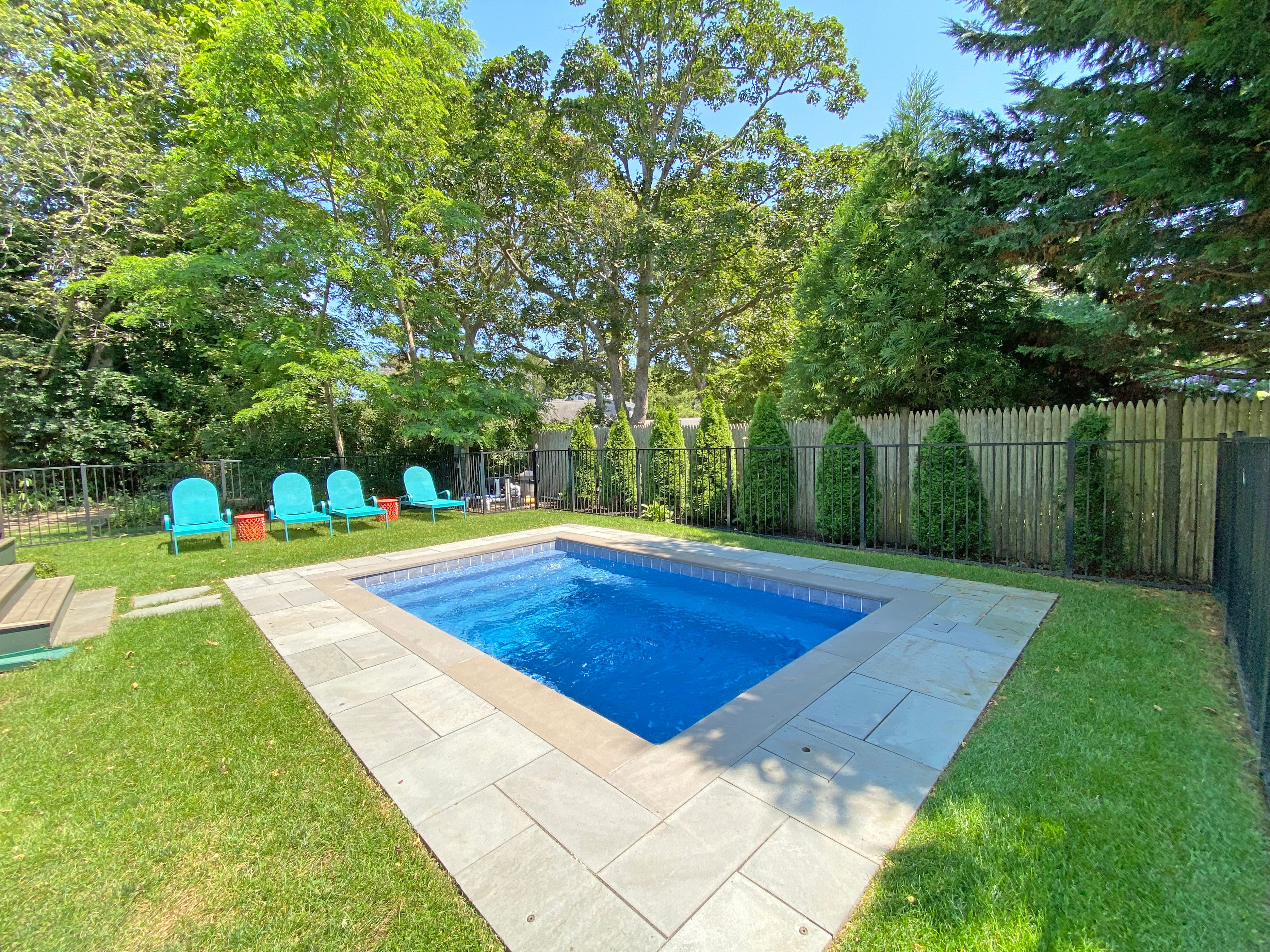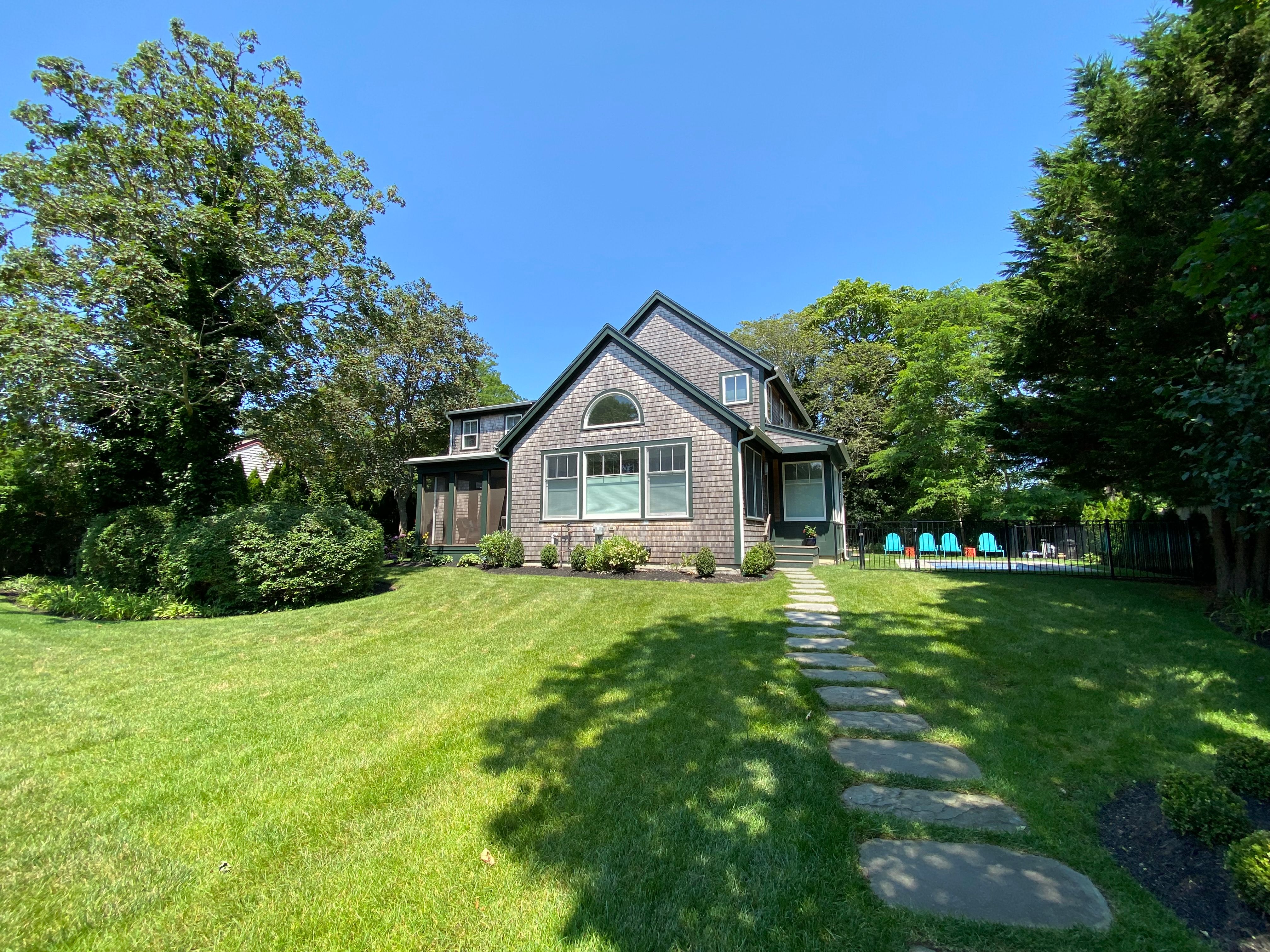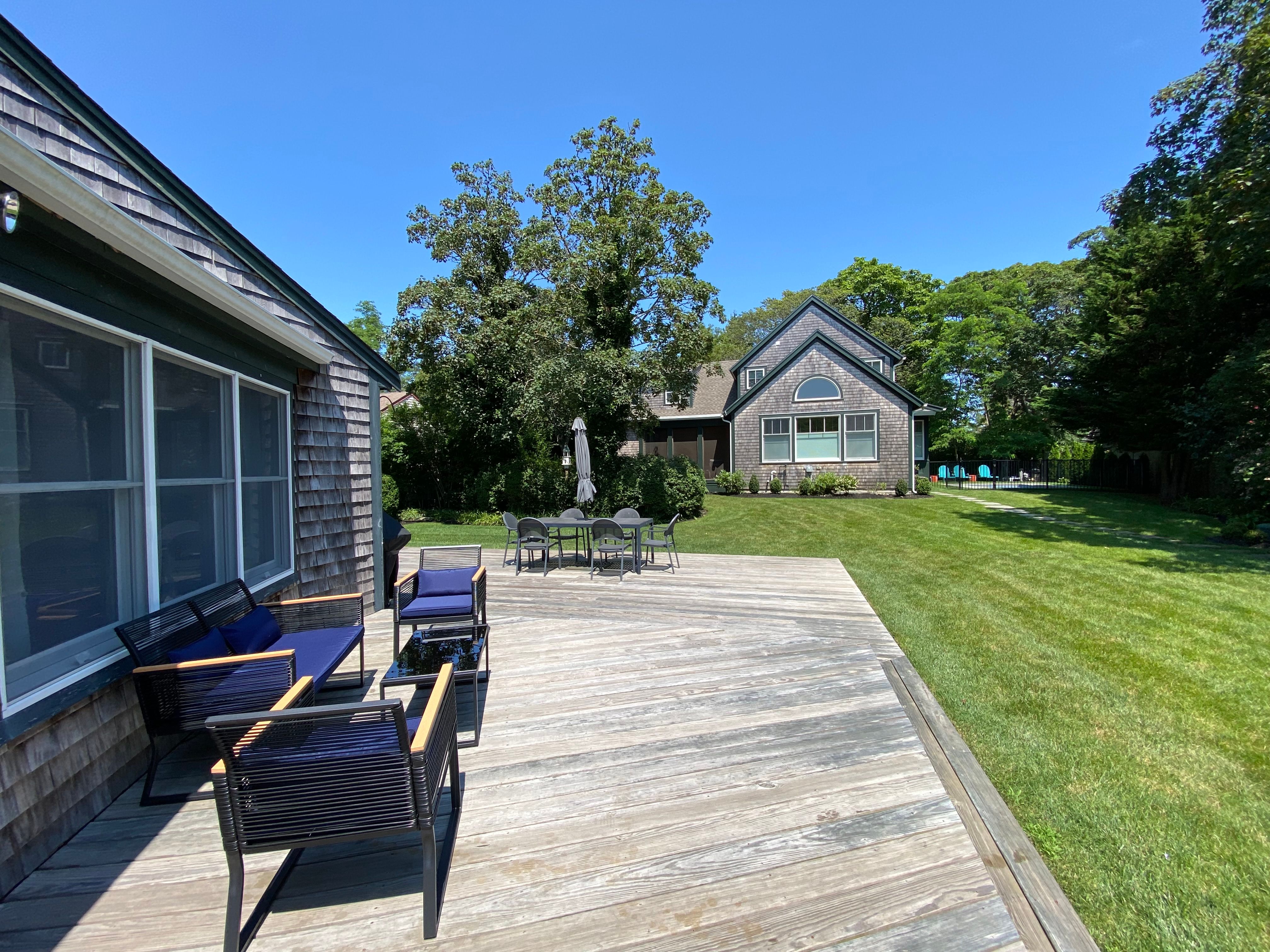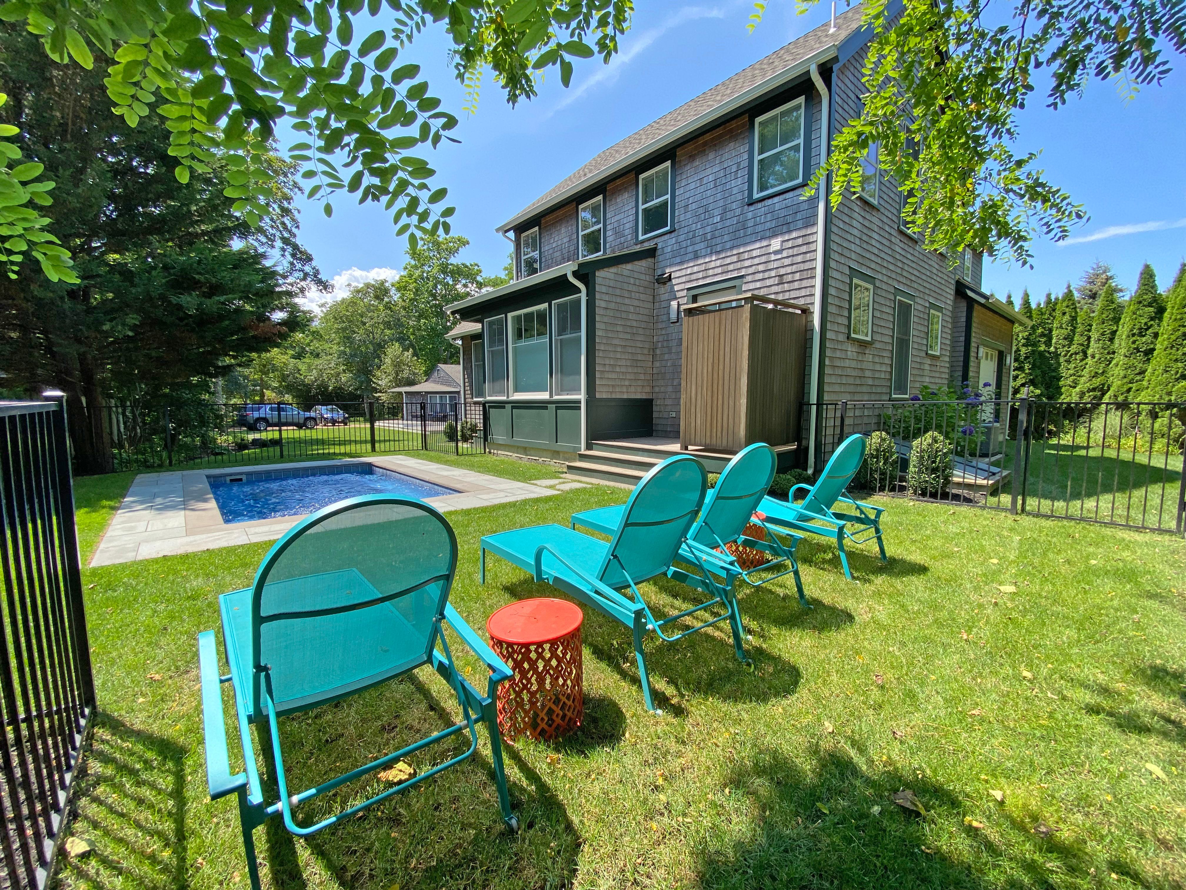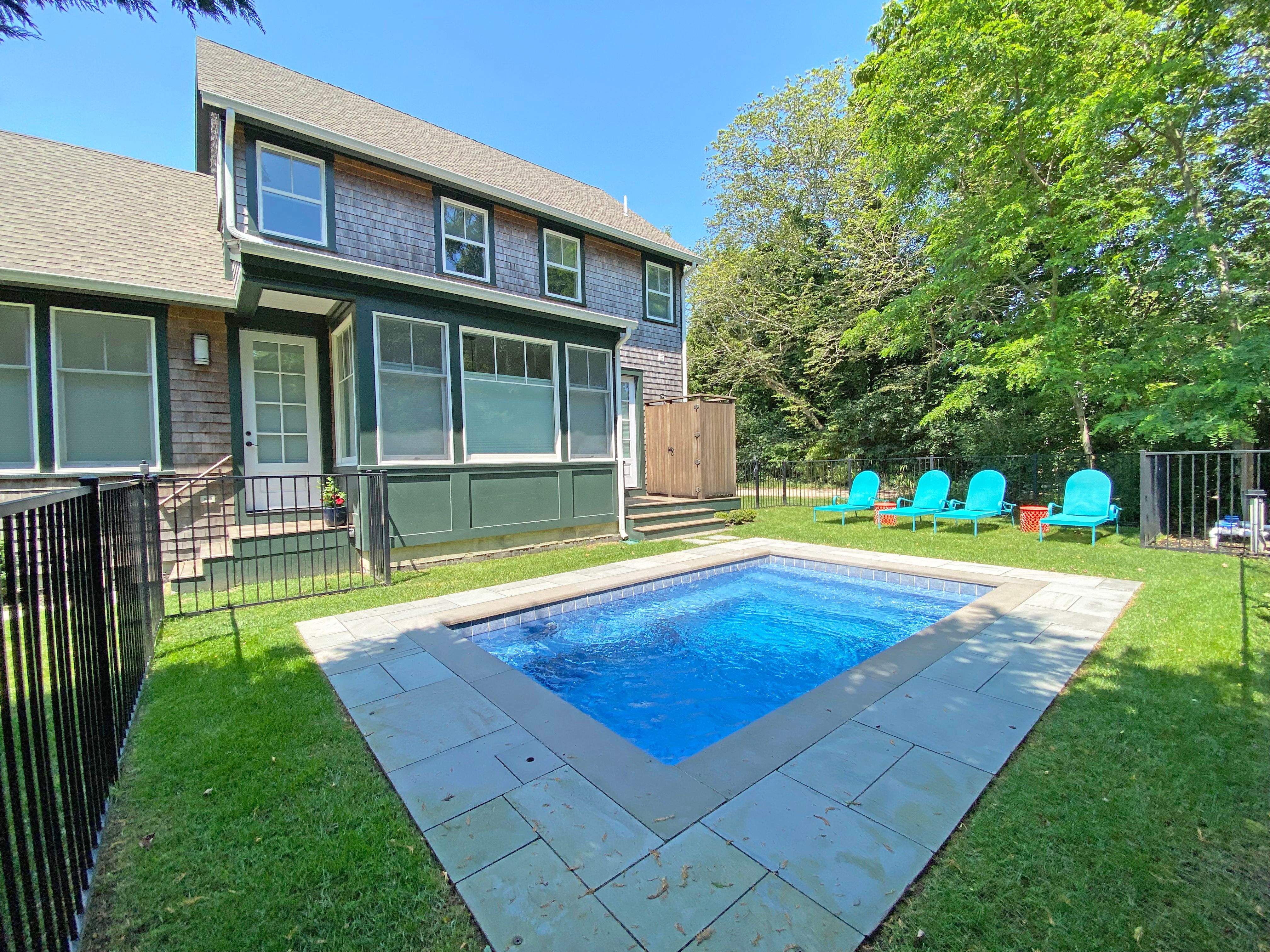 Walk to town from this Edgartown Compound which also has a heated pool (10x16). The main house has an open concept floor plan that opens out the back deck and pool. The home has 3 bedrooms all on the second floor. The primary bedroom has a private bathroom and a king size bed. The other two bedrooms share a hall bathroom. There is also a great screened porch.