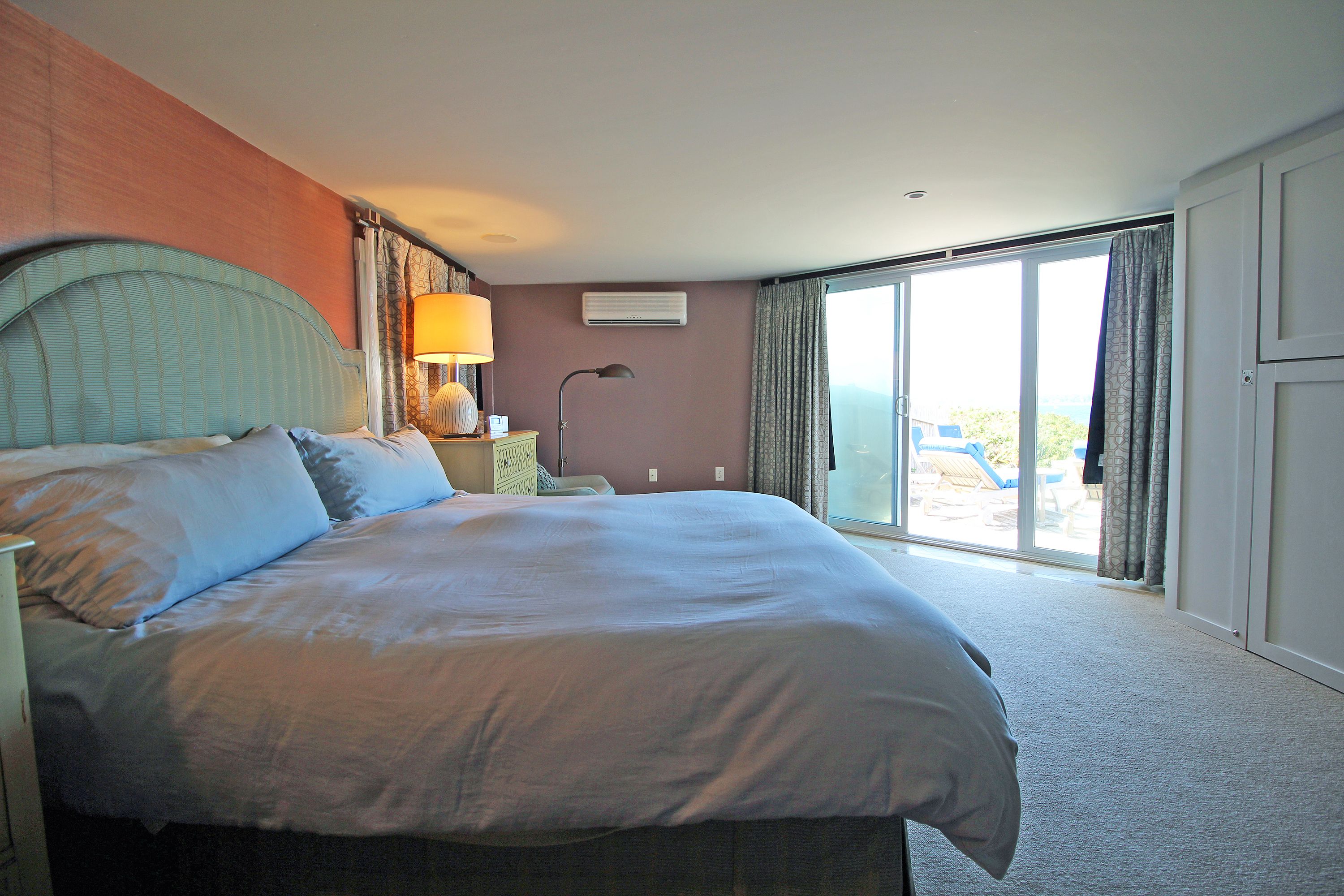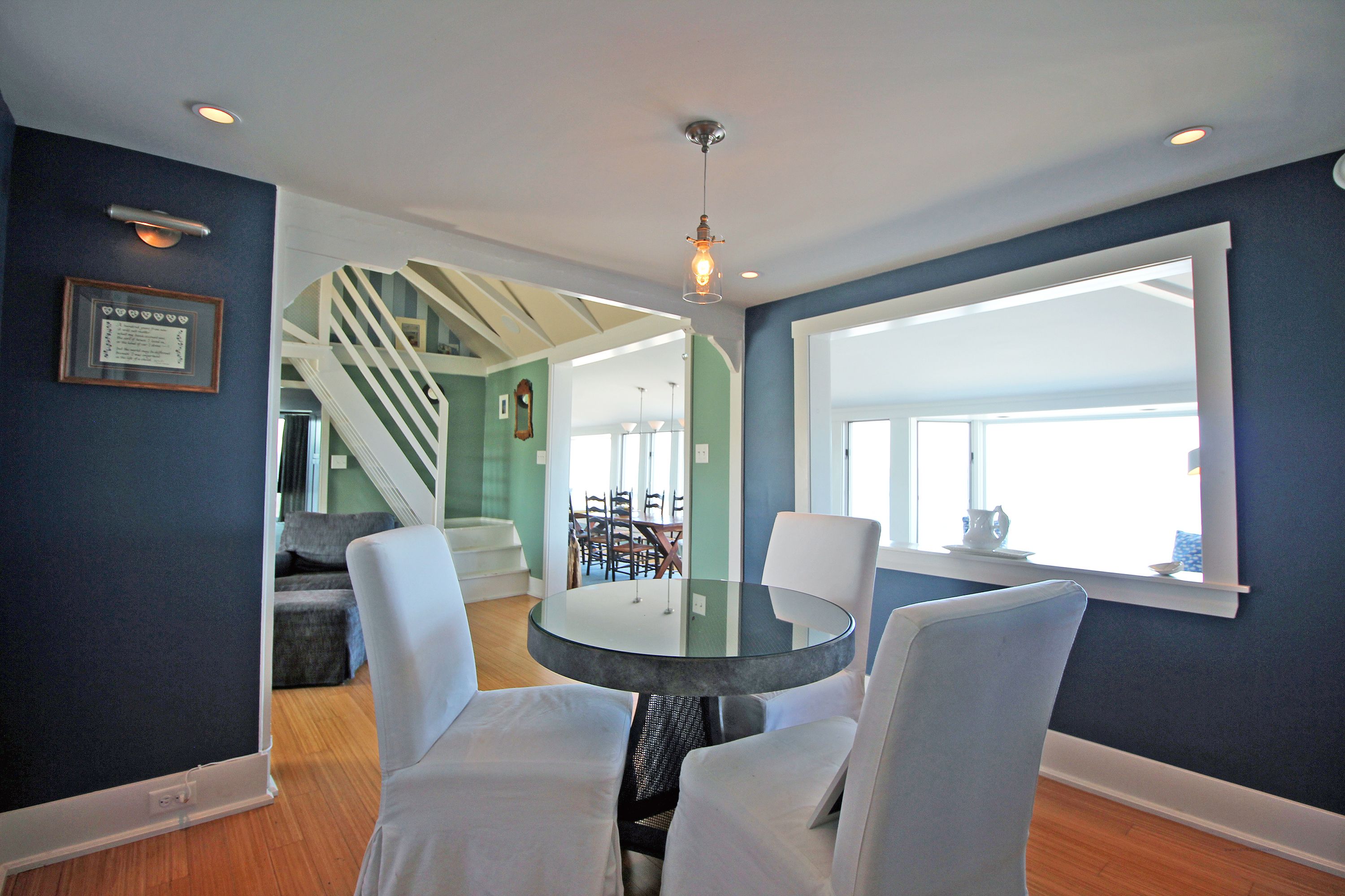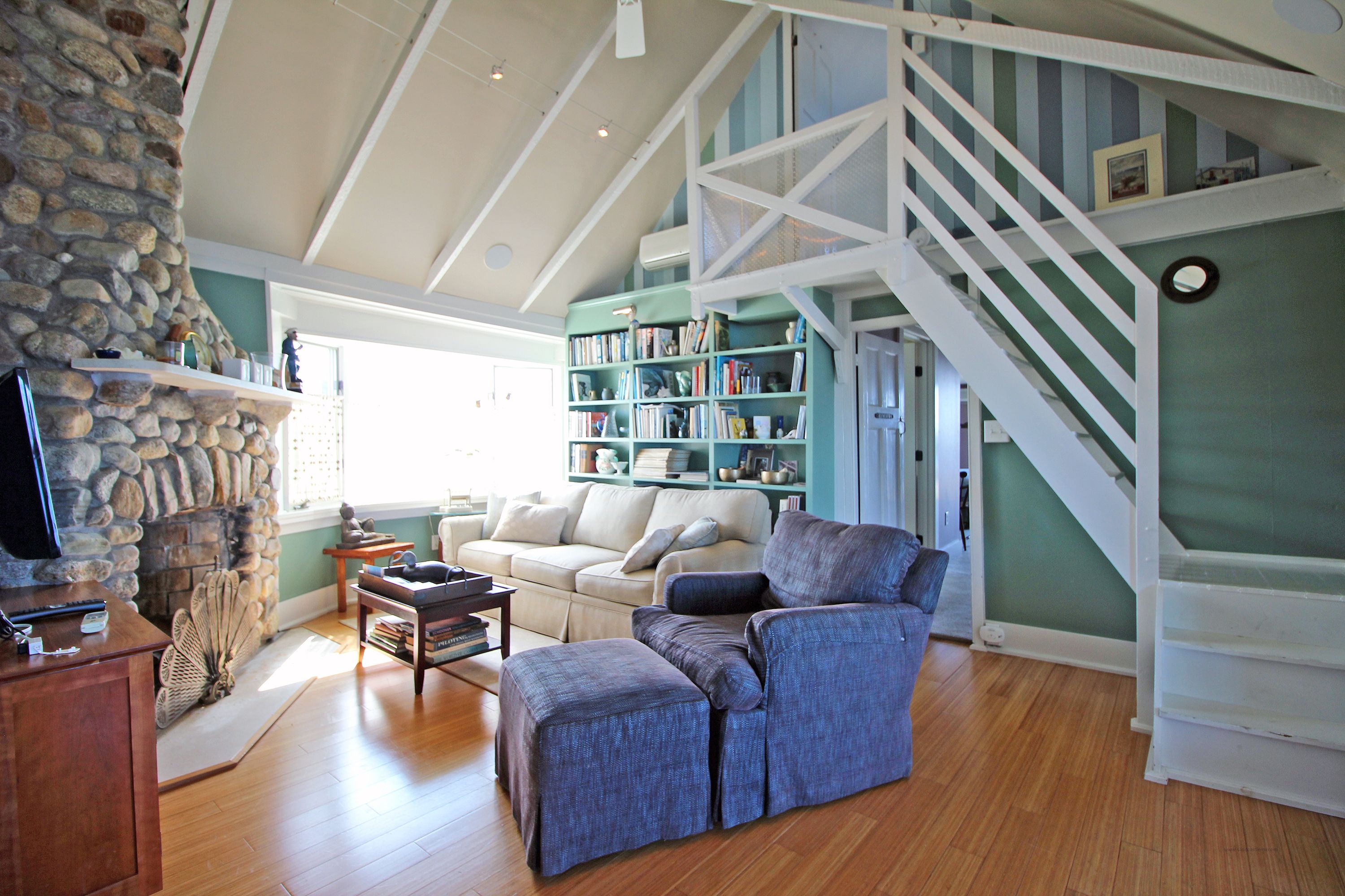 Two separate staircase lead you to the two additional bedroom. One is off the kitchen and a little steep and the second bedroom is off the living room. There are three mini split AC units to cool you off on hot days. One in the king master bedroom, one in the living room and one in the sun room.