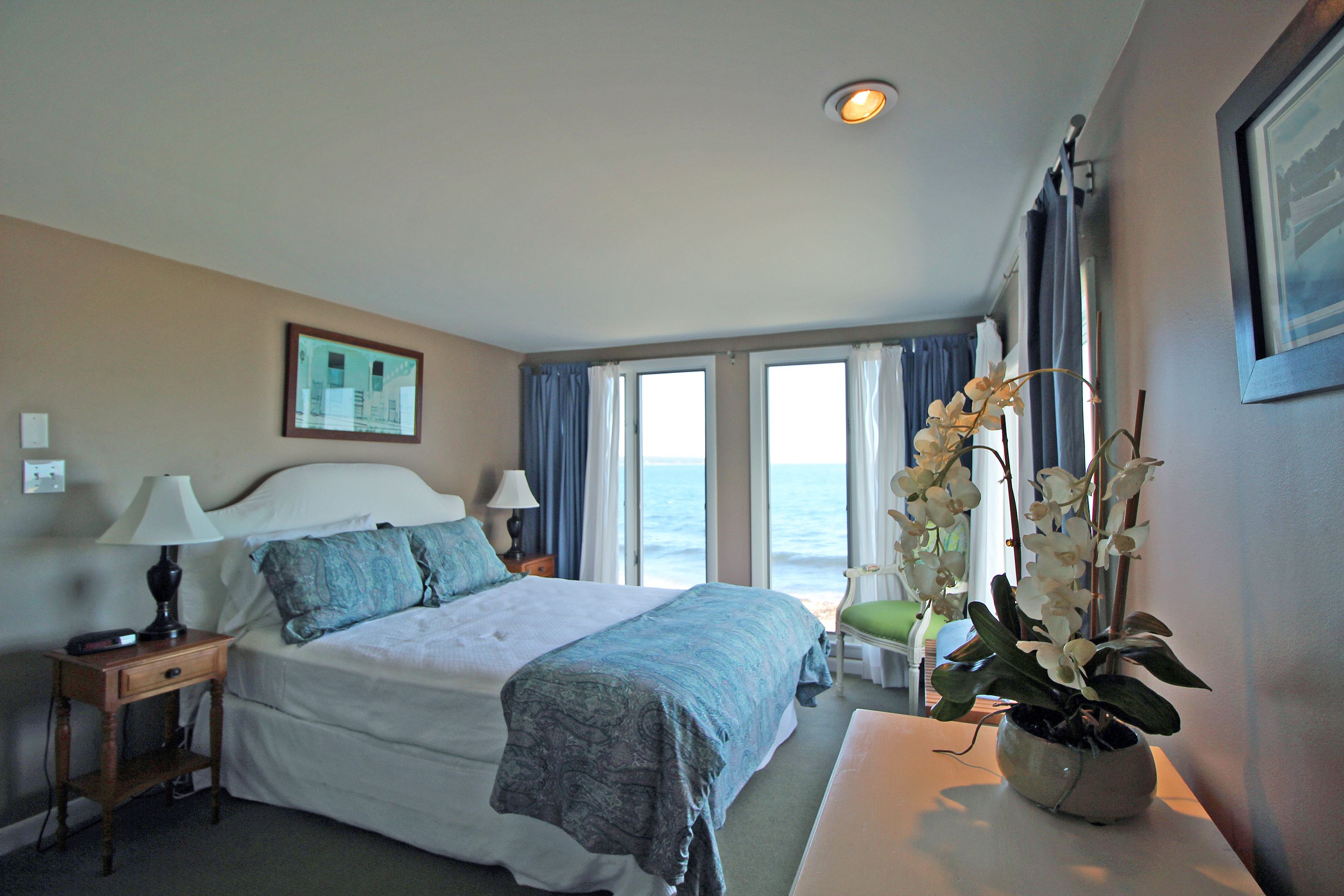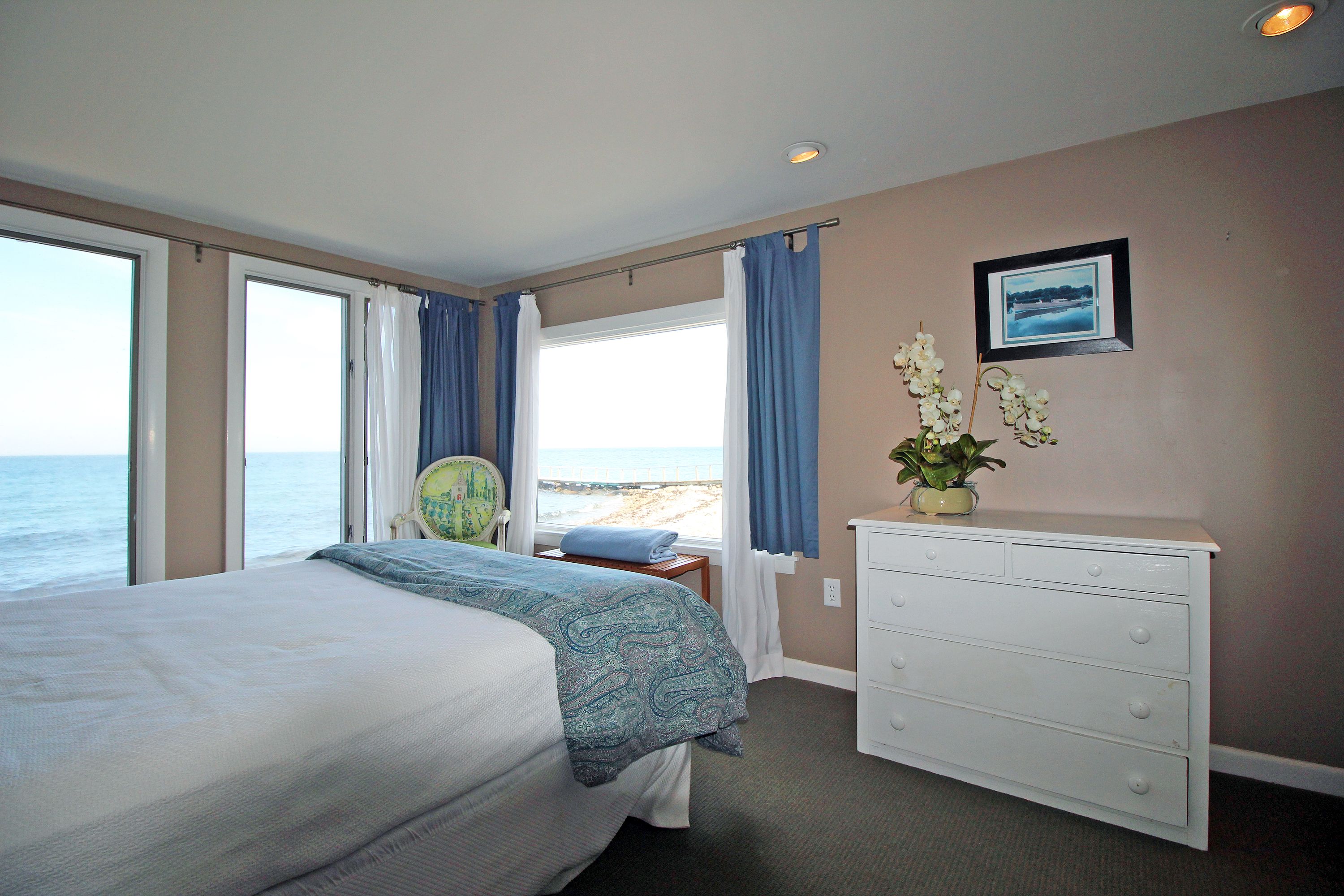 There are two bedrooms on the first floor. One generous size king bedroom with private bath and a second queen bedroom both have views of the water. There is a shared full tiled bathroom with shower on this level as well.