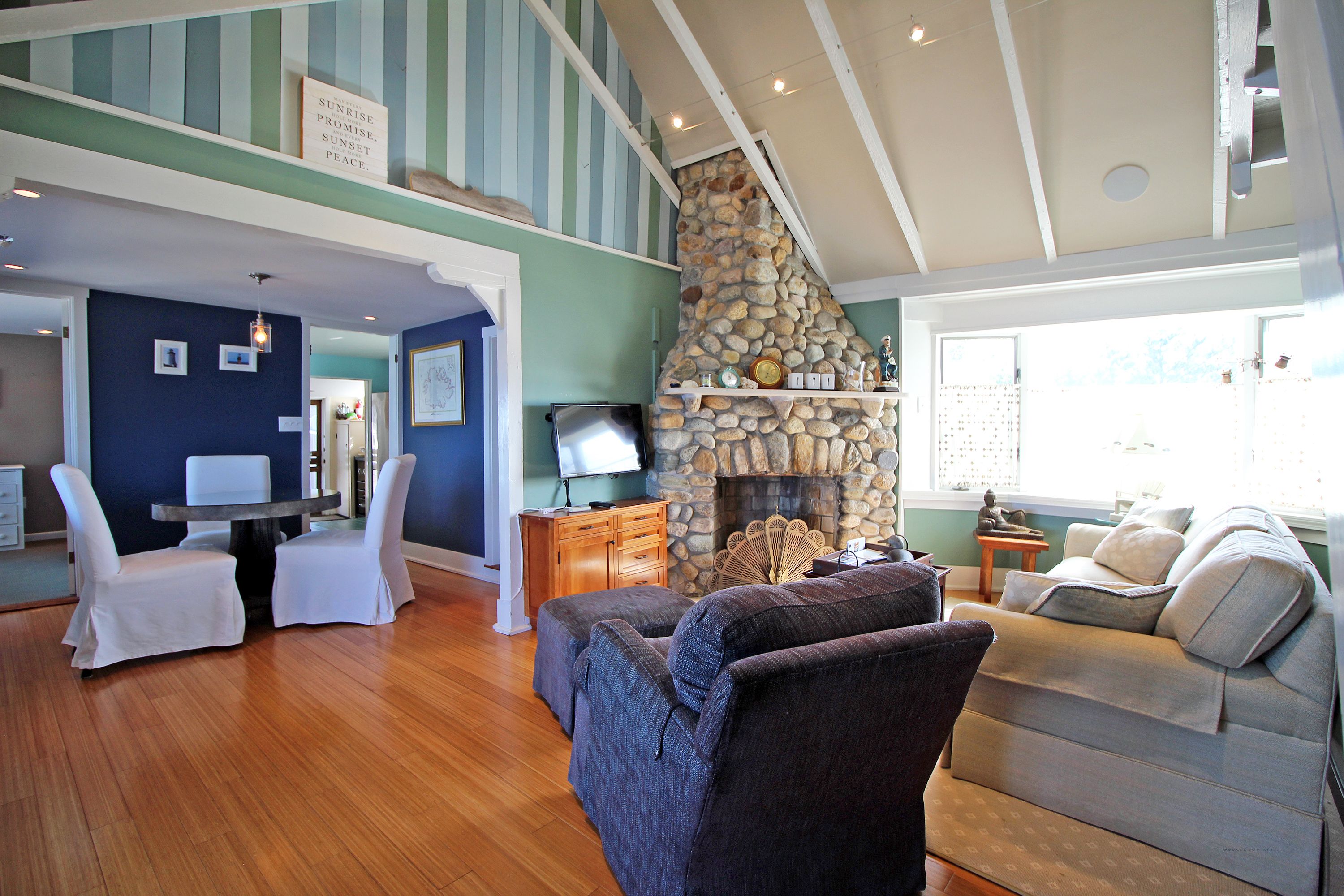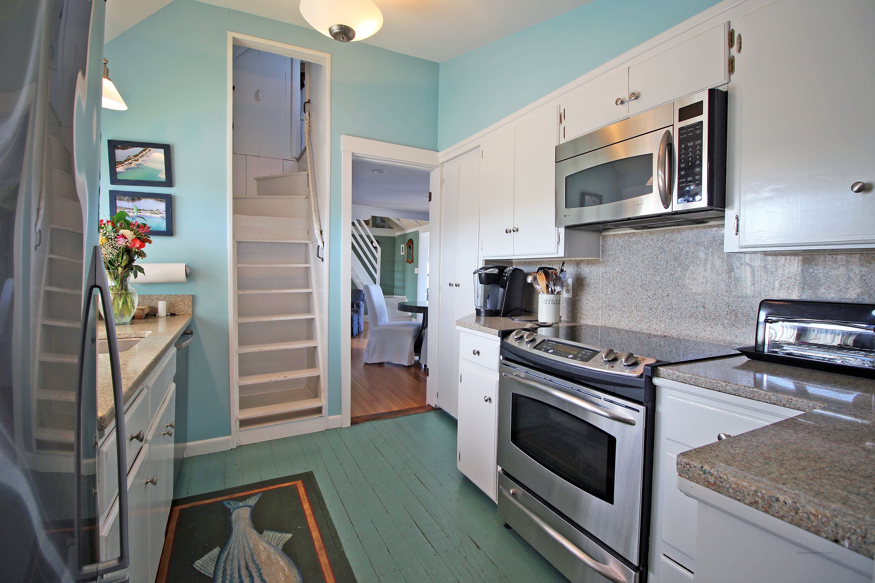 Inside is tastefully decorated with coastal colors. The first floor consists of an updated kitchen with granite counter tops and stainless steel appliances. The kitchen flows to a breakfast nook and living room with beach stone fireplace.