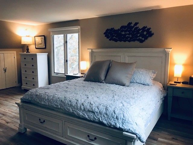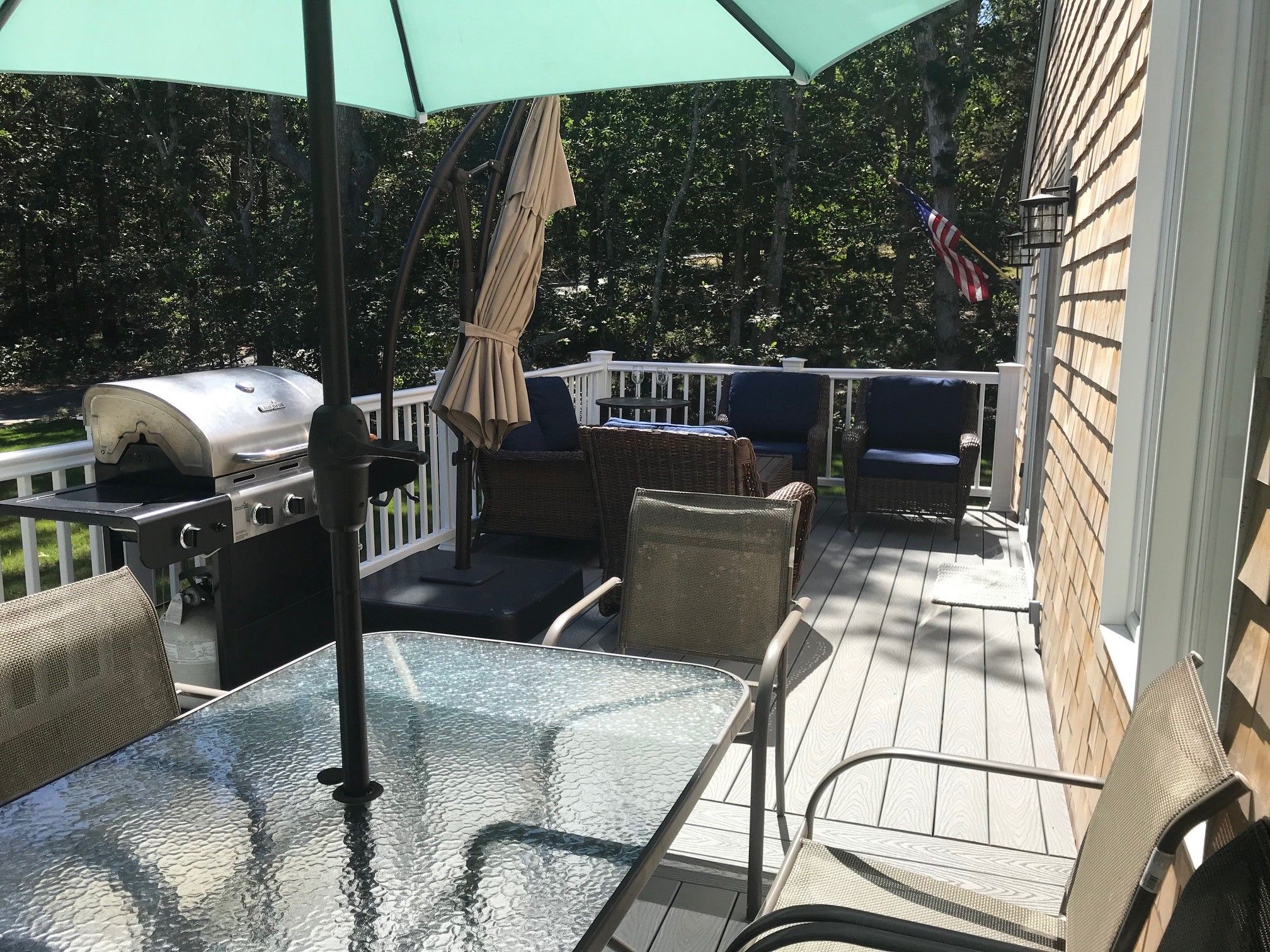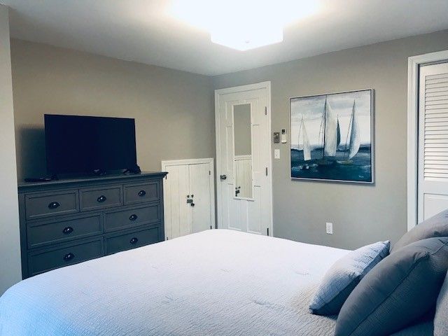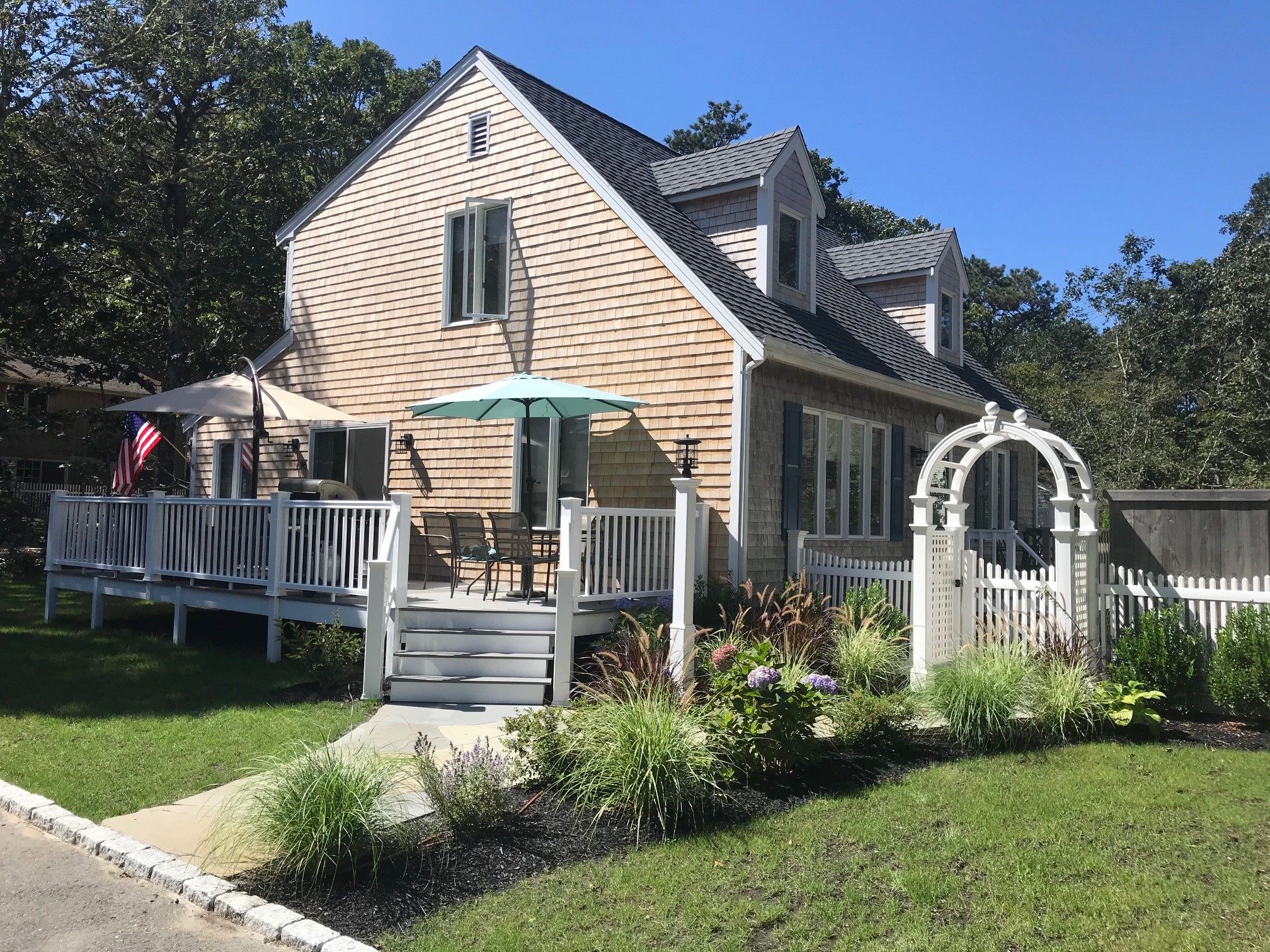 A beautifully decorated, open and bright Cape style home situated within a 5 minute stroll to Sengekontacket Pond water access (perfect for kayaking and canoeing, or sitting on the bench to enjoy your morning coffee while watching the wildlife). A few more minutes and you’ll reach the Caroline Tuthill Wildlife Preserve with plenty of walking trails and water access perfect for young children to swim or go clamming. State Beach is just on the other side of the Pond and the paved bike path to Edgartown (2.5 miles) , Oak Bluffs and Vineyard Haven is just at the end of the street. This air conditioned home offers an open floor plan so the whole family can be together in the living, dining and kitchen areas; and there’s a TV room just off the main living area that can be closed off with stylish barn doors or left open for you to watch the little ones. There is a large master bedroom with a king size bed and TV, as well as a kids bedroom on the second floor with three beds. And, a separate first floor “master” with a queen bed and TV, perfect for grandparents or teenagers looking for their own space. Of course, take advantage of outdoor living with the outdoor shower, gas grill and a wonderful deck to enjoy gathering, eating and star gazing at night with family and friends.