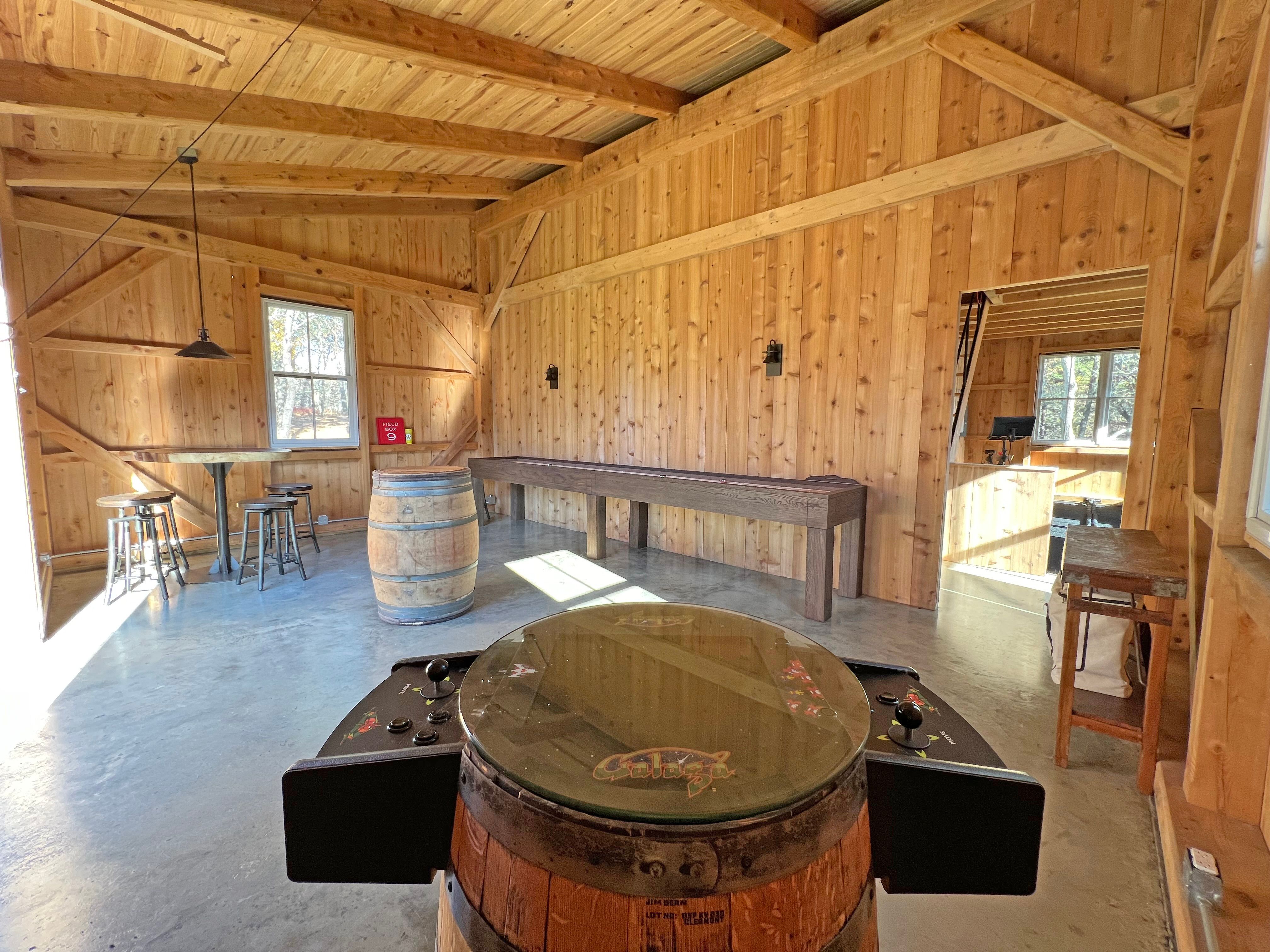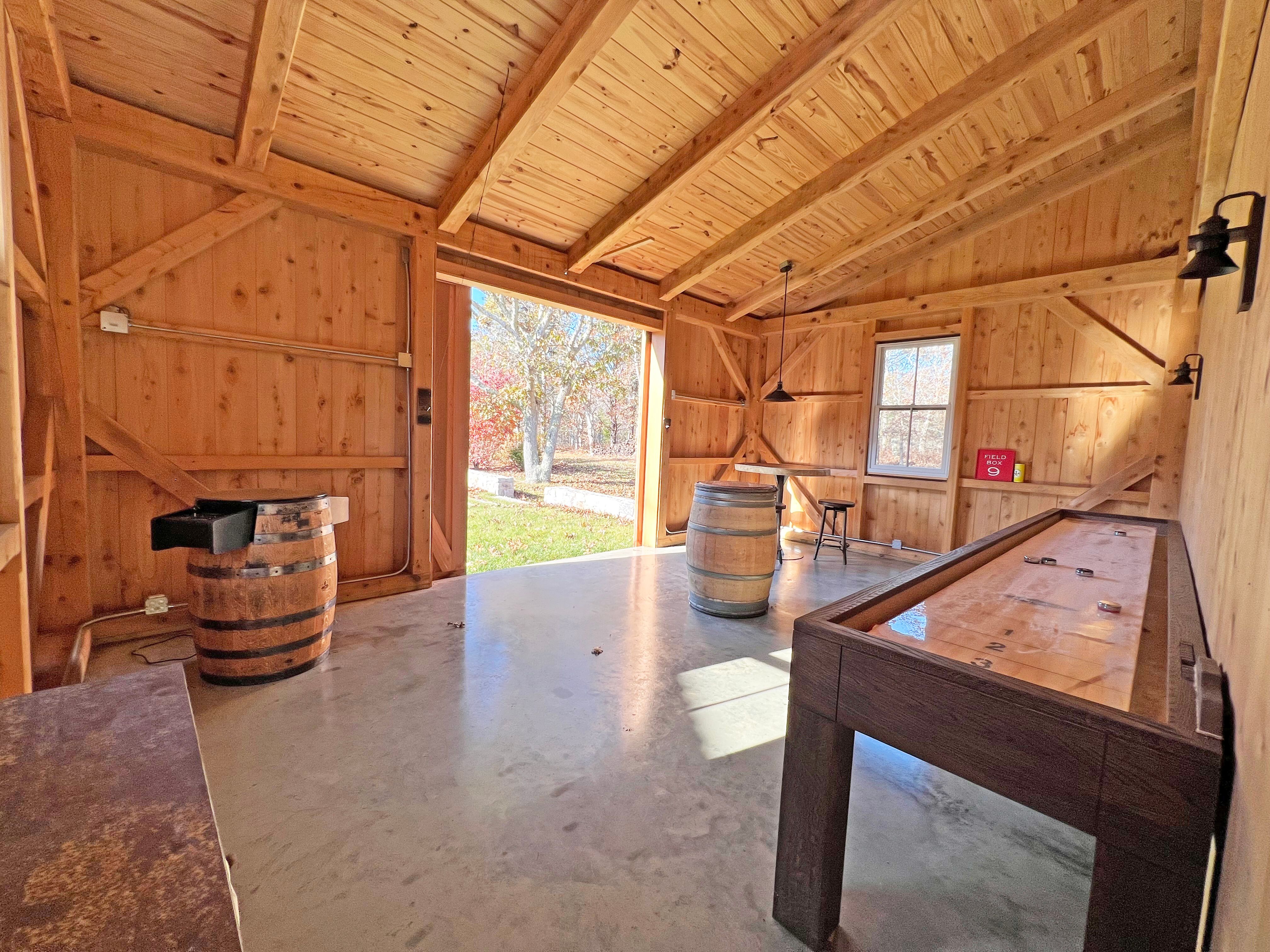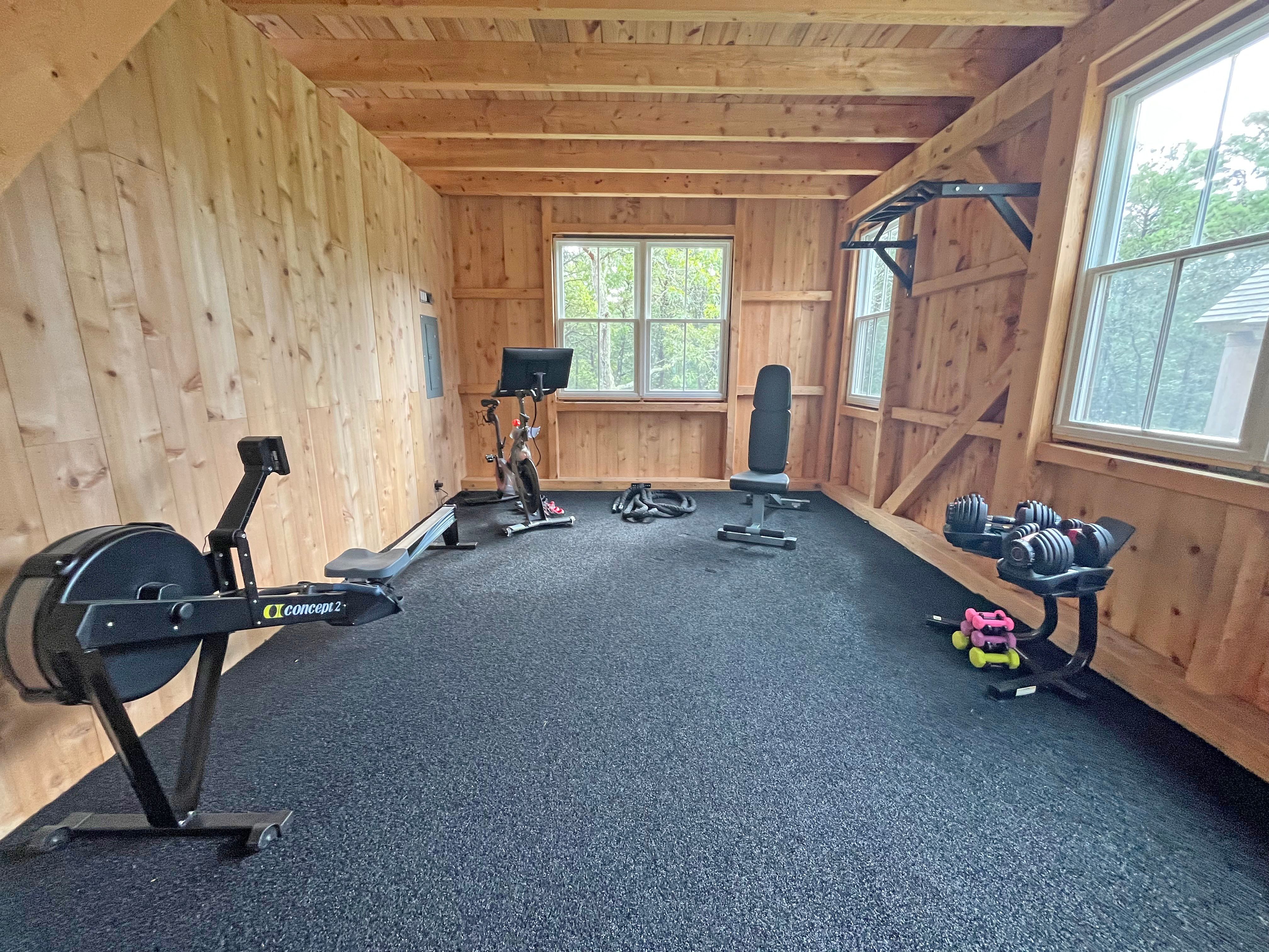 Barn with game room, and gym area with Peloton, row machine, free weights, bench, and stretching machine. New for the 2025 season a cedar barrel sauna and cedar cold plunge area to outside.