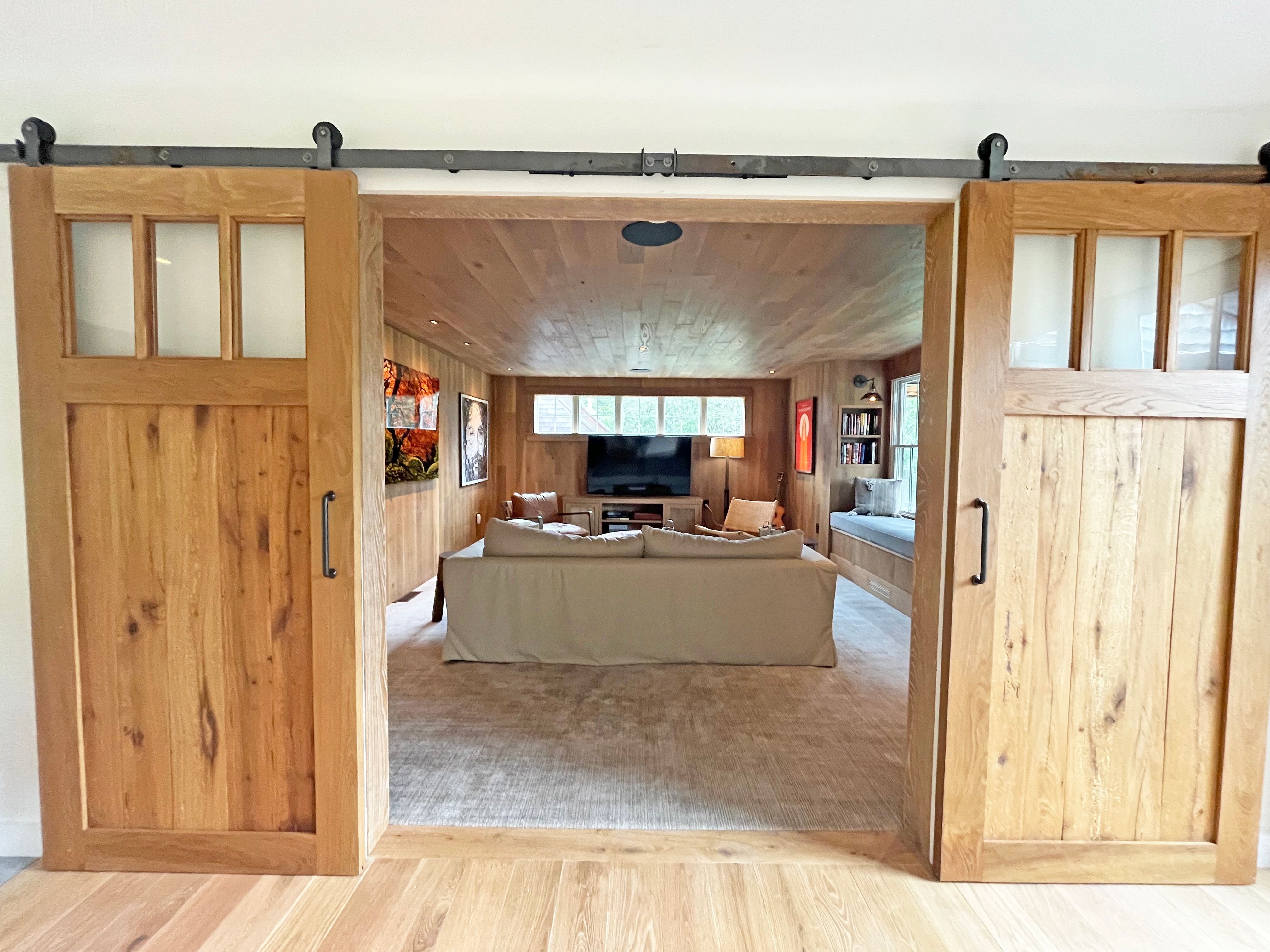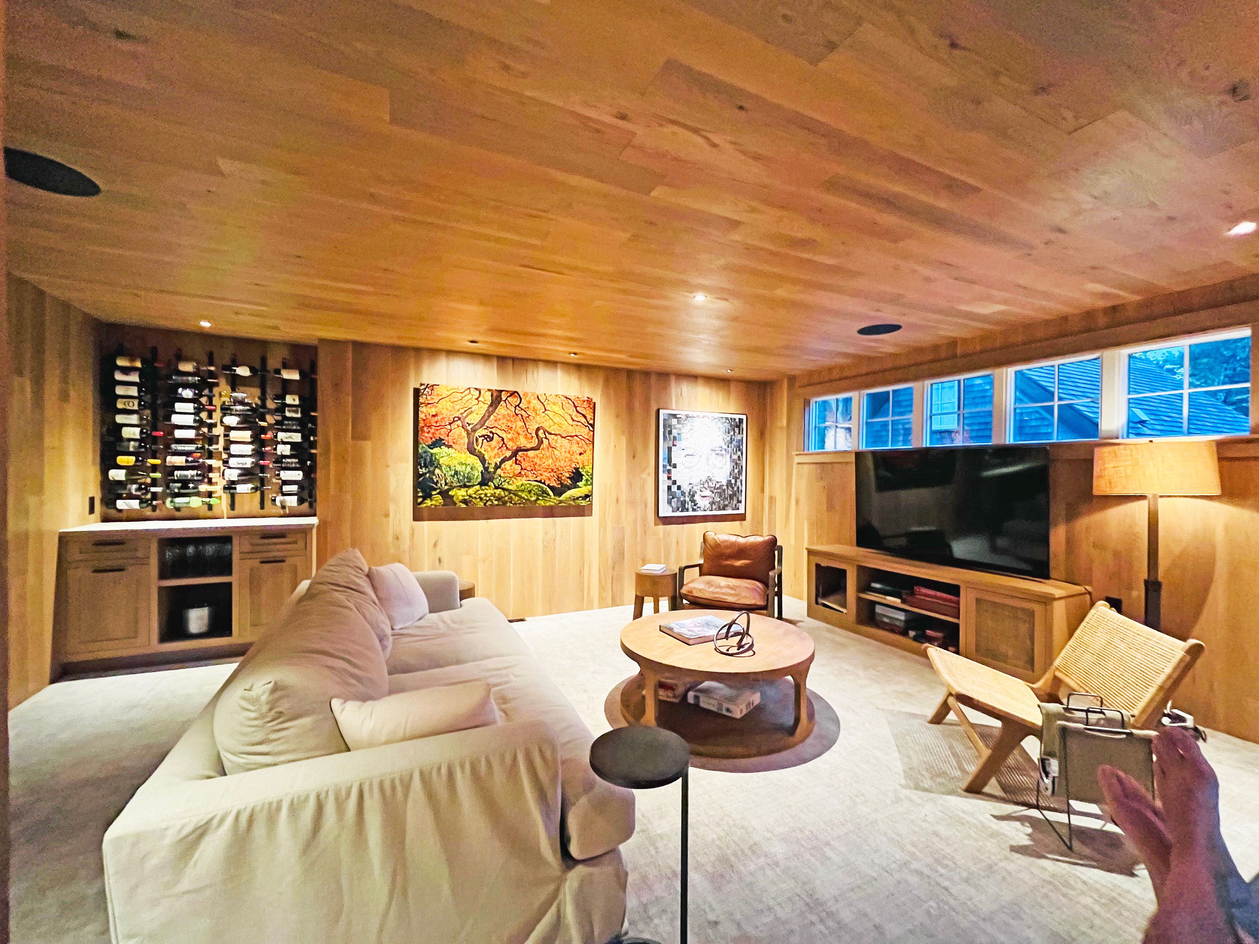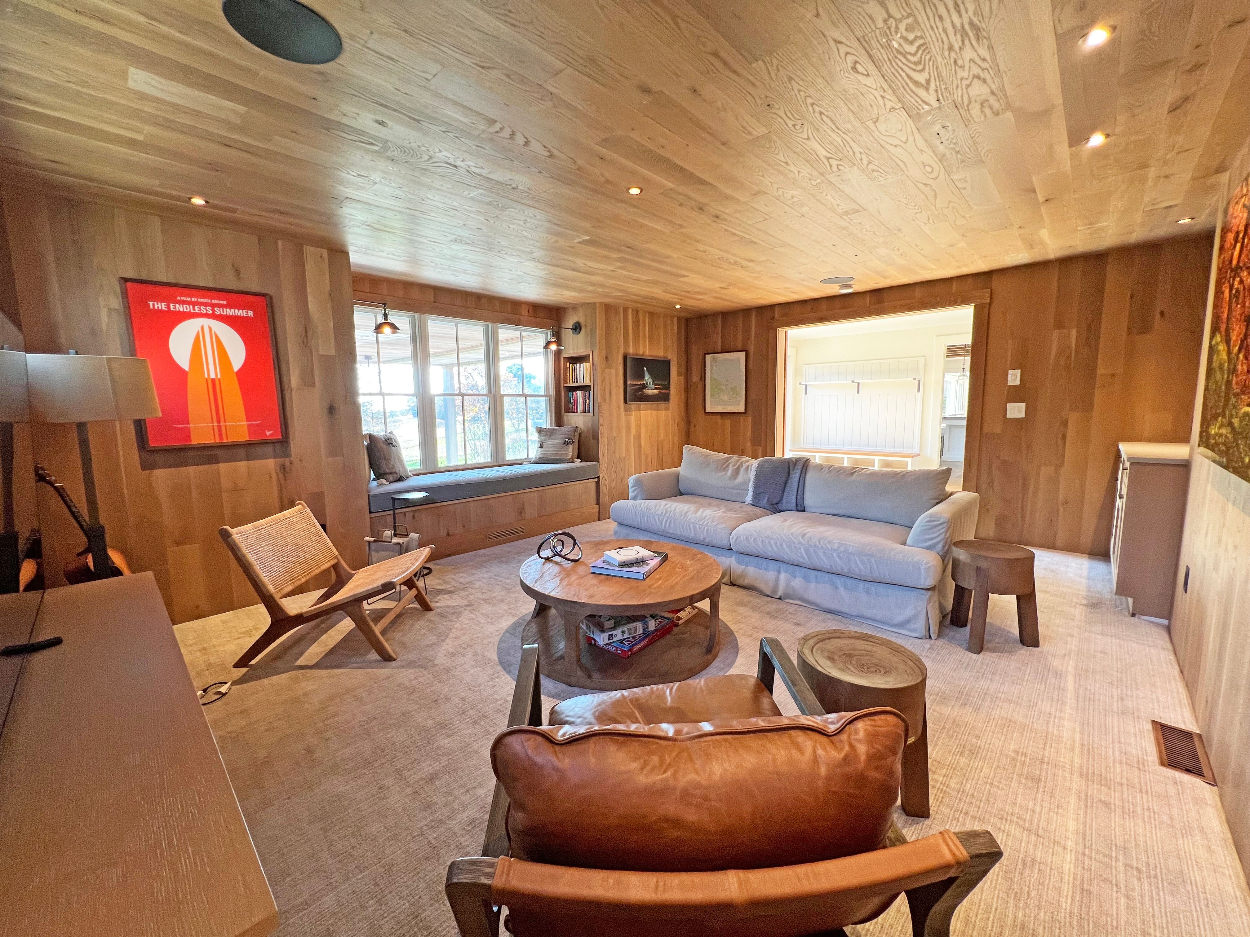 Barn with game room, and gym area with Peloton, row machine, free weights, bench, and stretching machine. New for the 2025 season a cedar barrel sauna and cedar cold plunge area to outside.