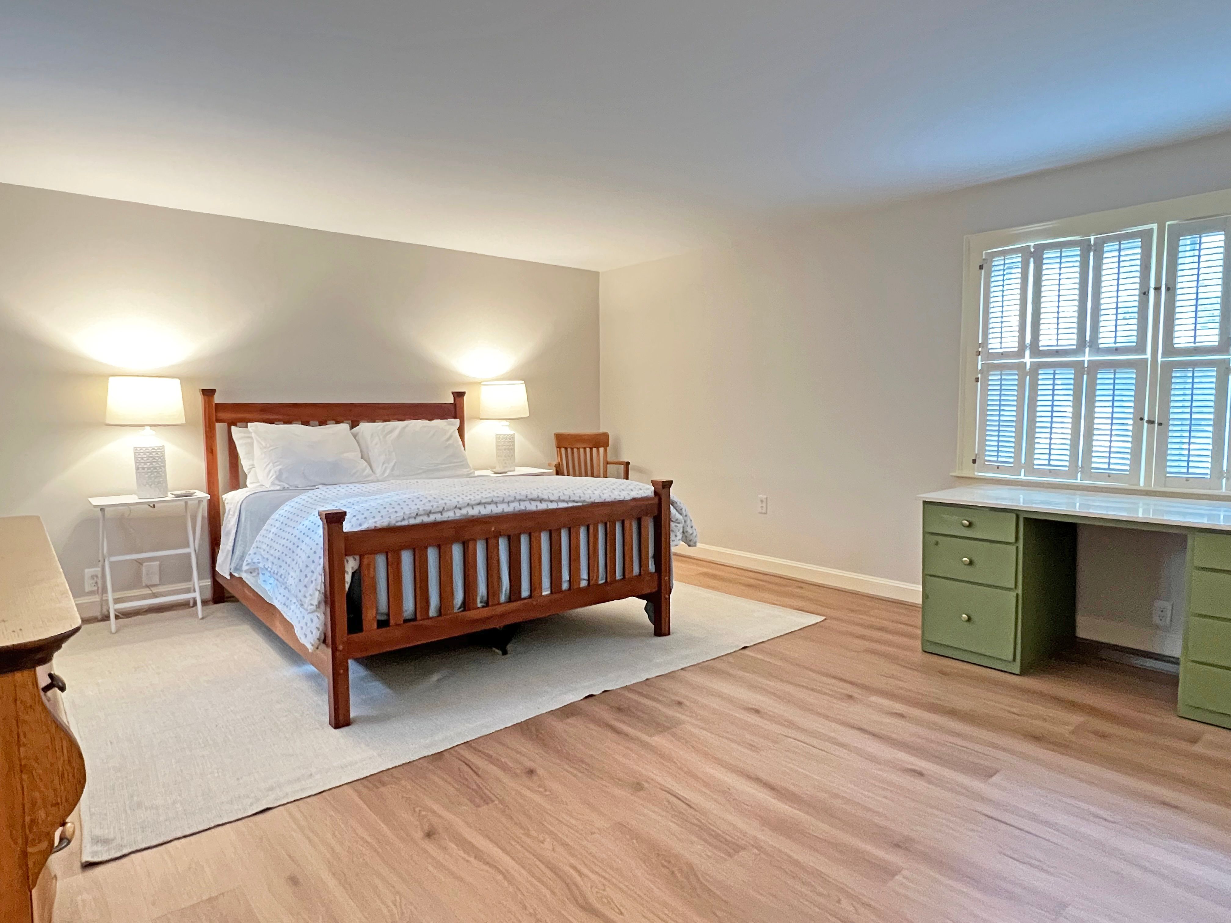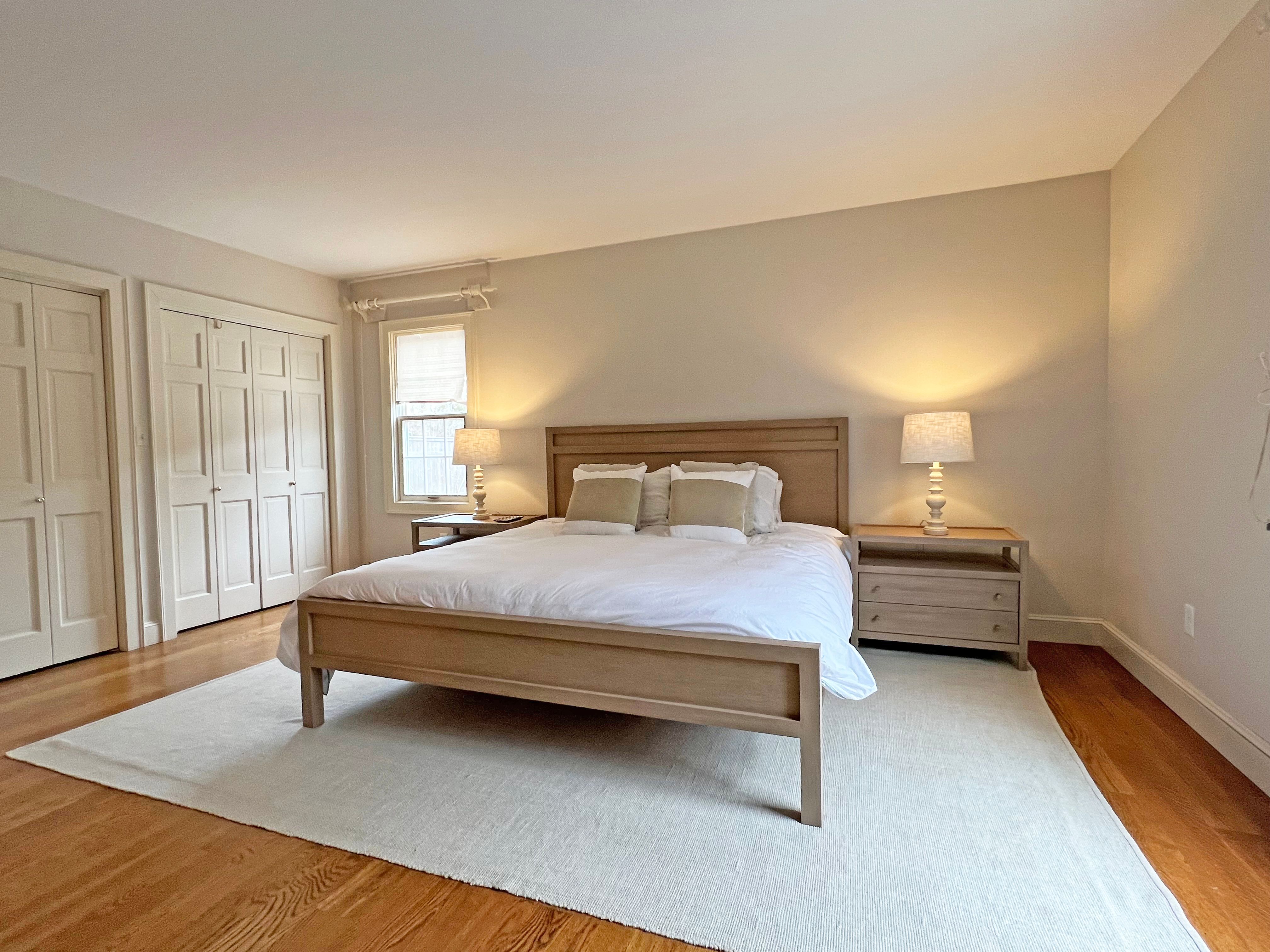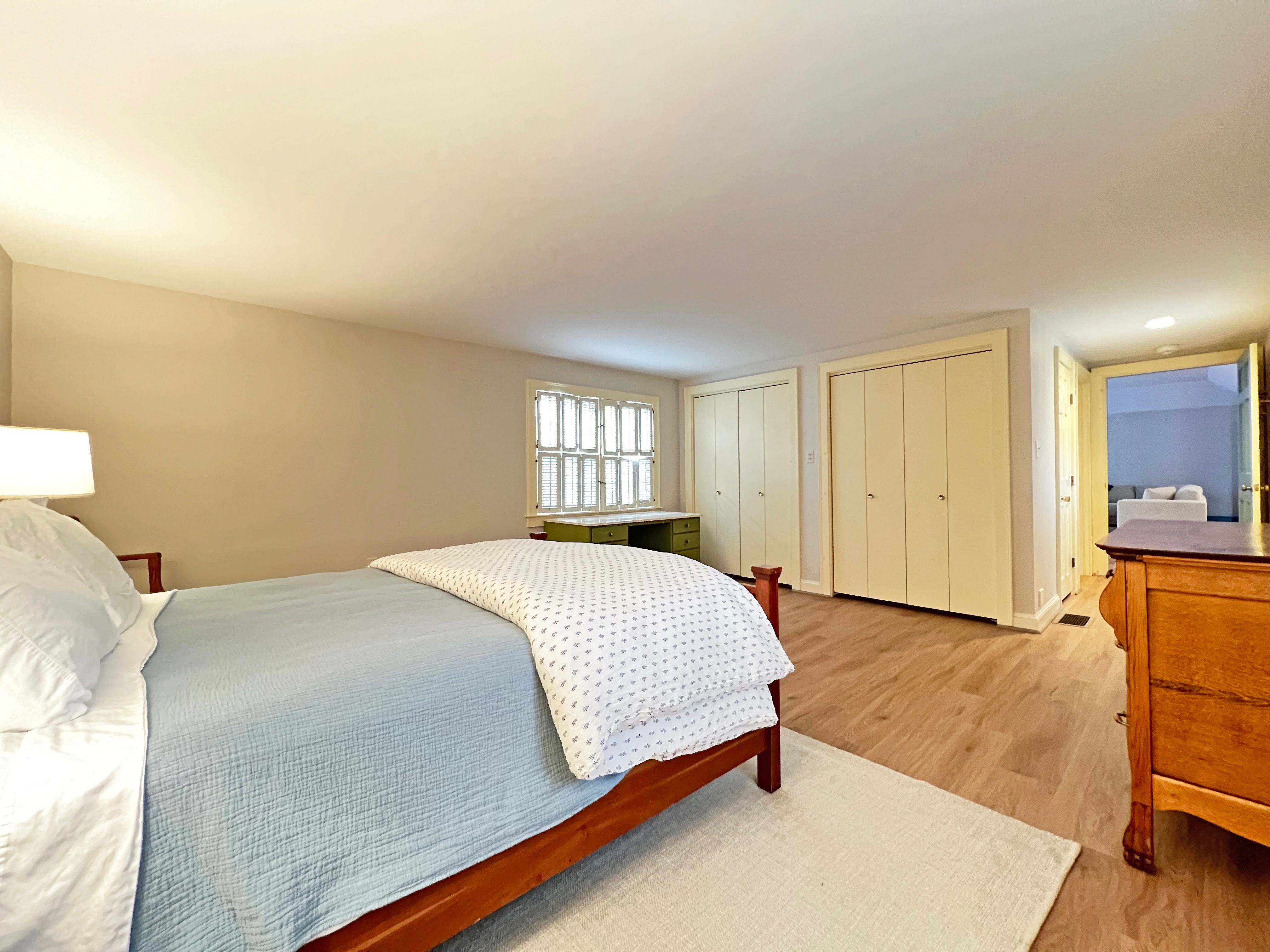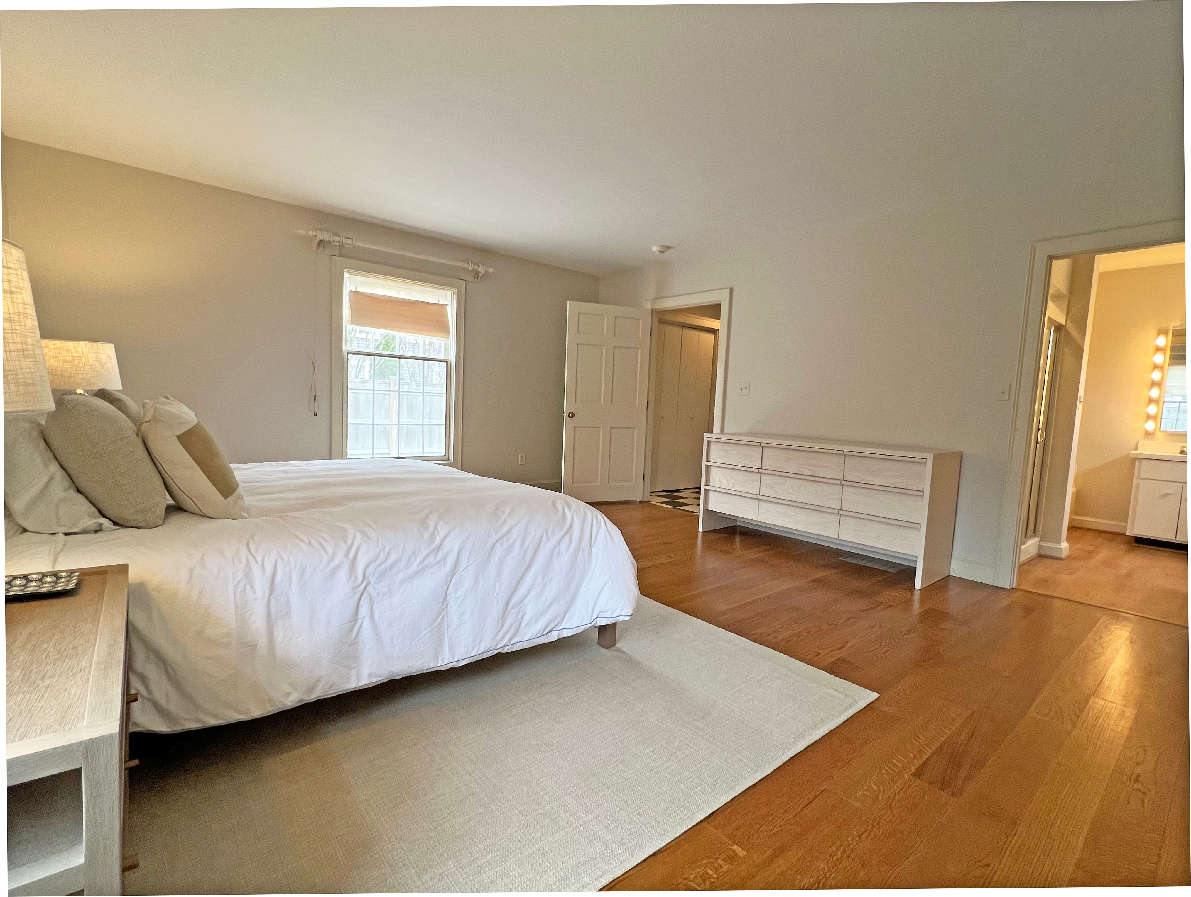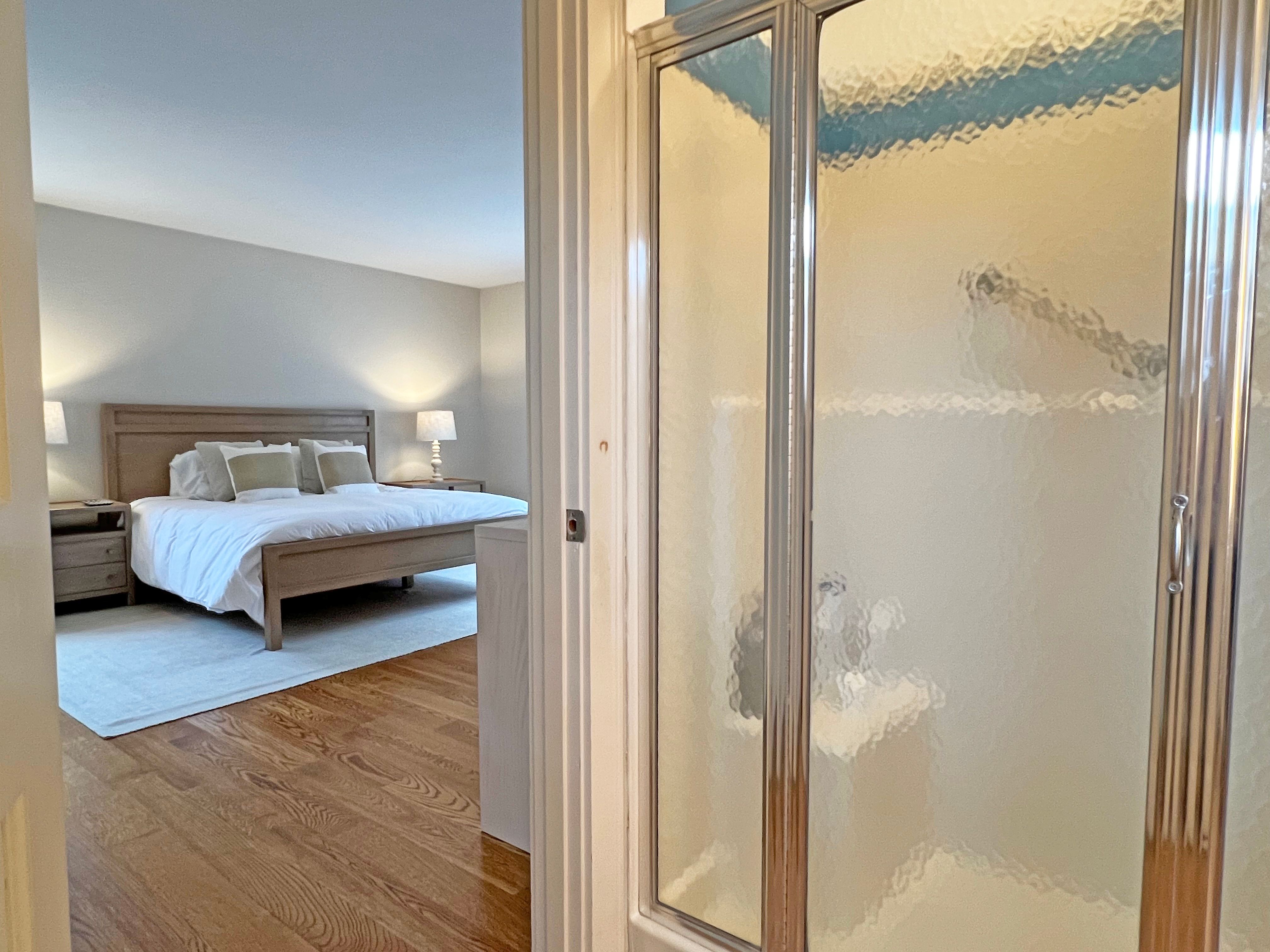The bedrooms are on opposite sides of the home. The master bedroom is generous in size and has a king bed with en-suite bathroom. The second bedroom has a queen and there is a bathroom just outside in the hallway.