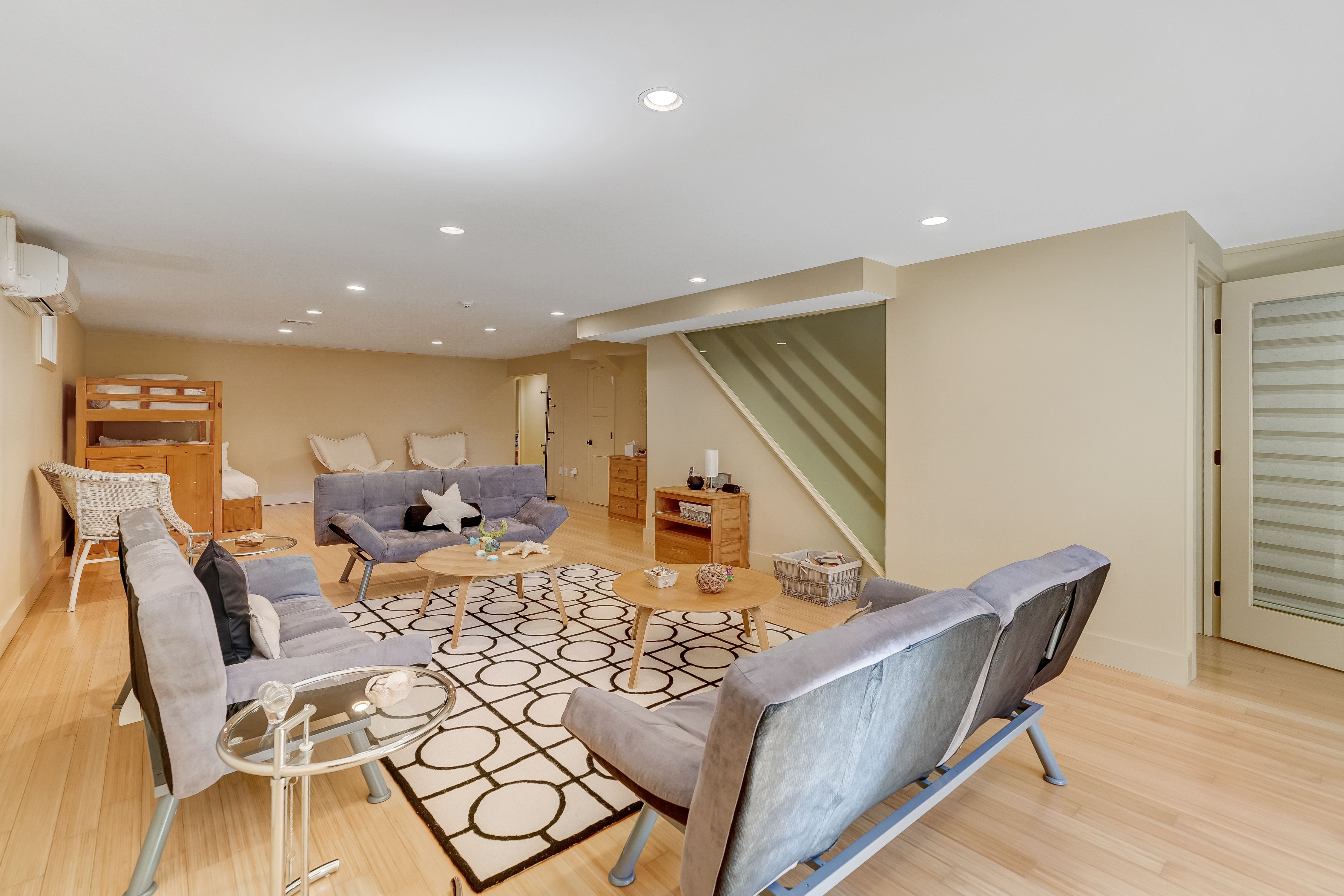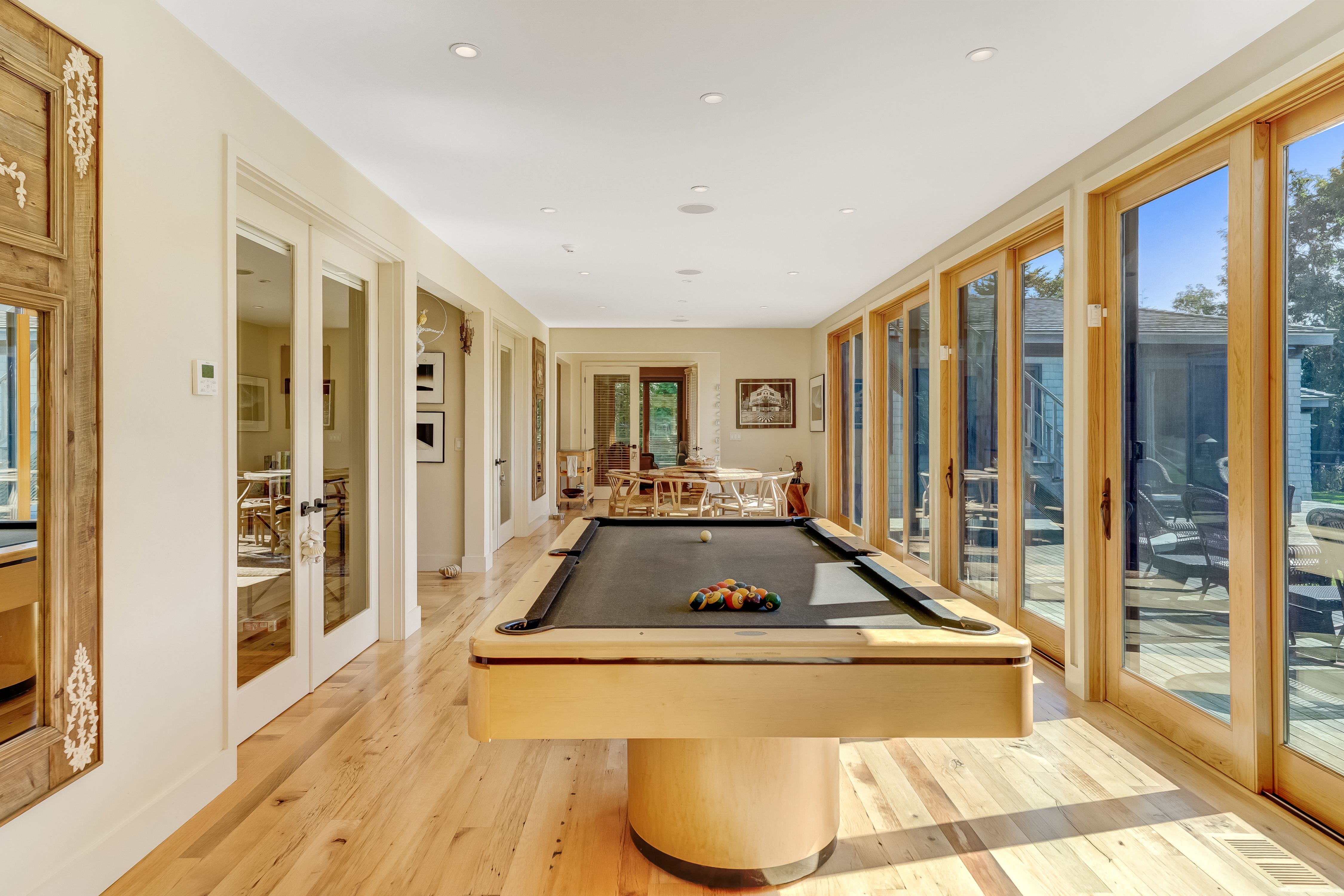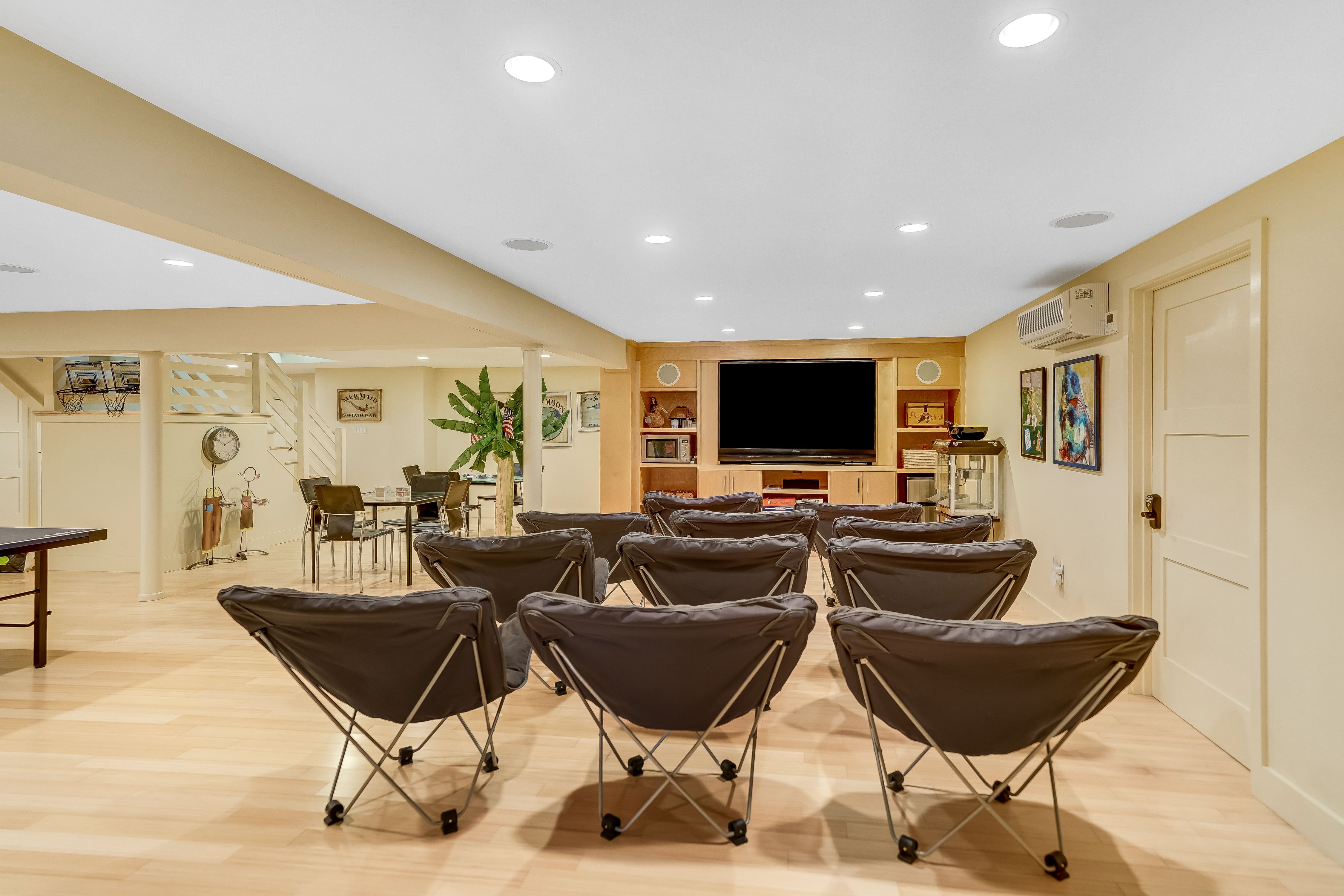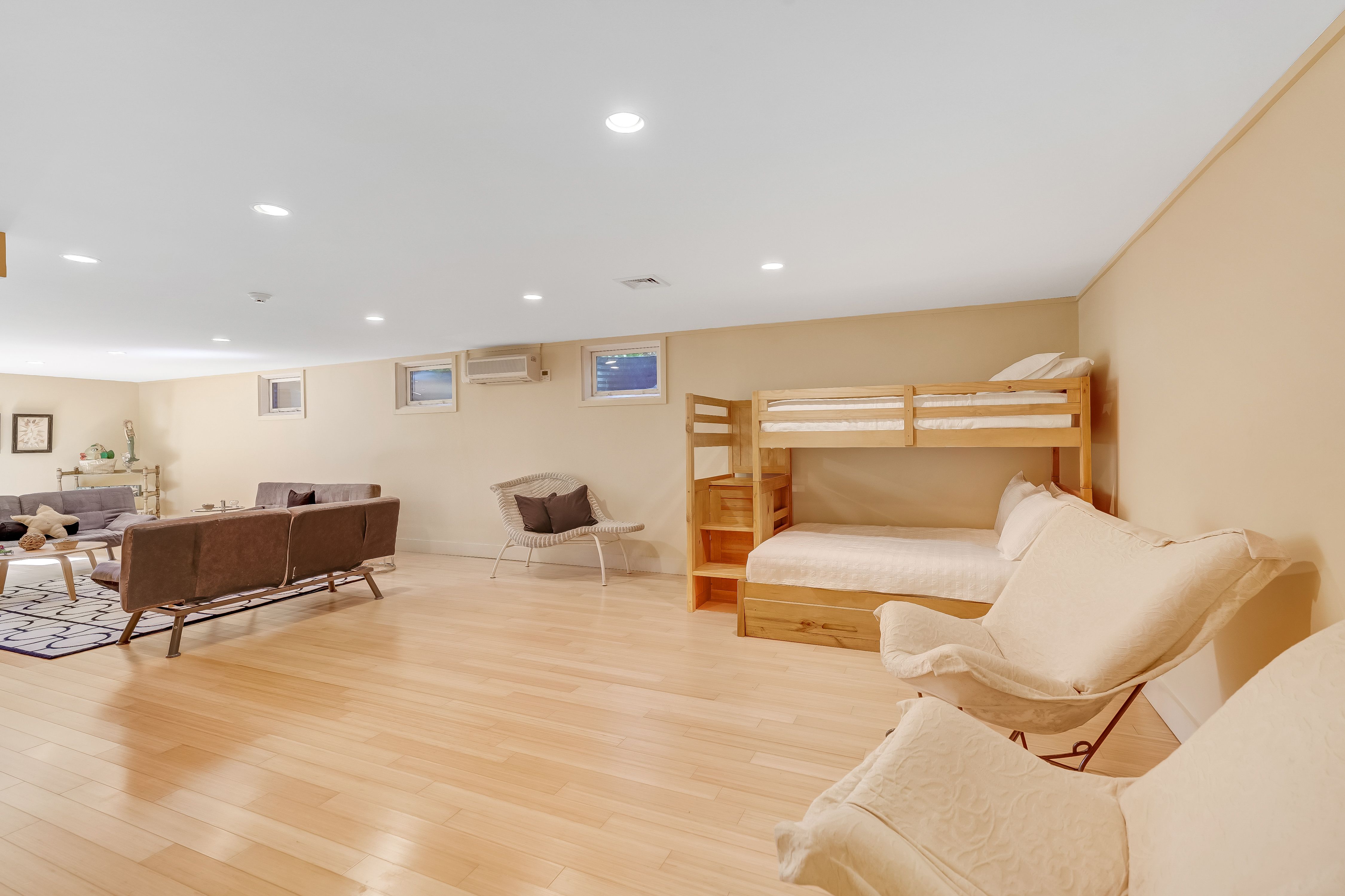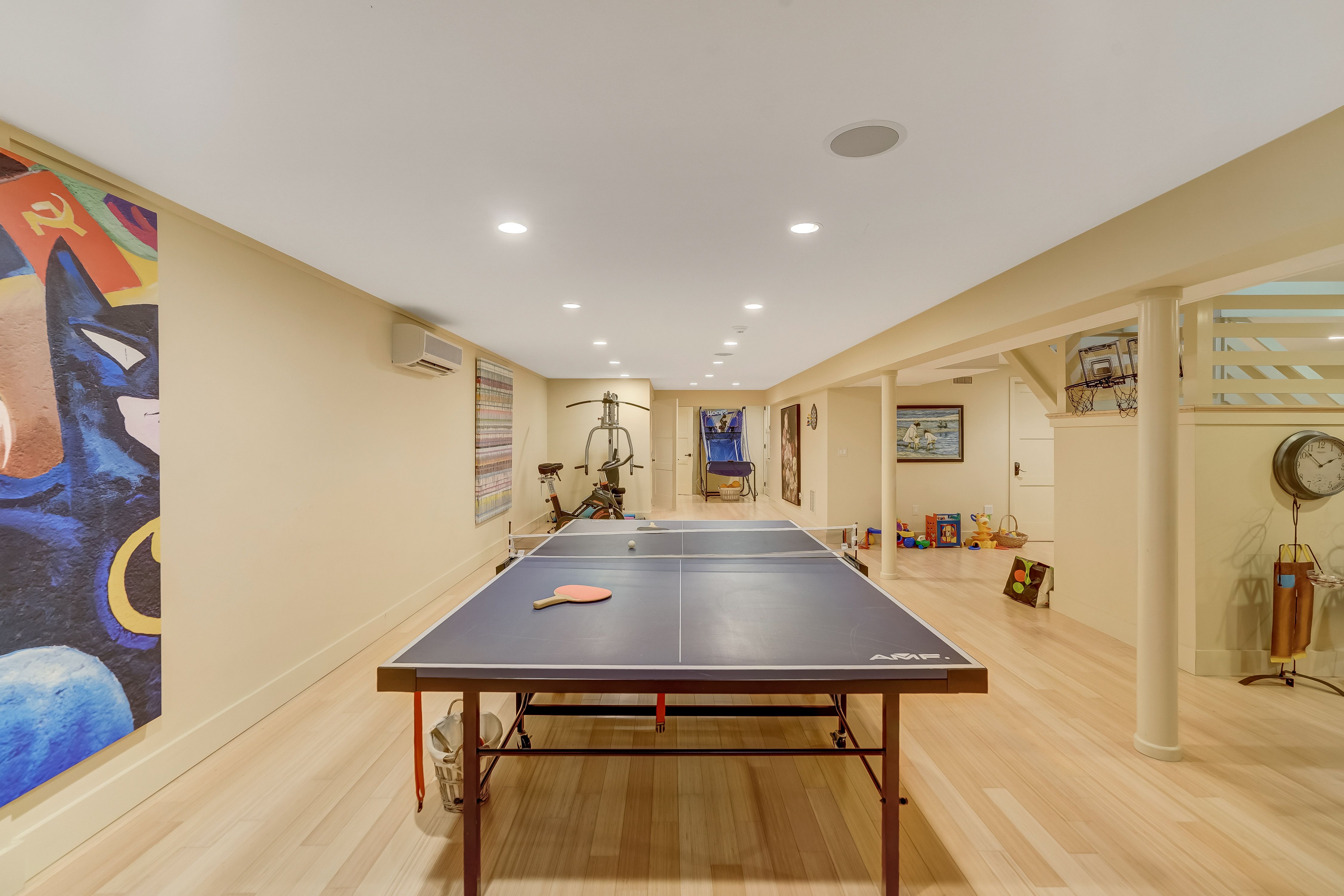 Lower-level feature two more suites provide ideal accommodations for children or guests, complete with bunk beds, private baths, and access to a game and media room with ping pong, exercise space, and a cozy play zone.