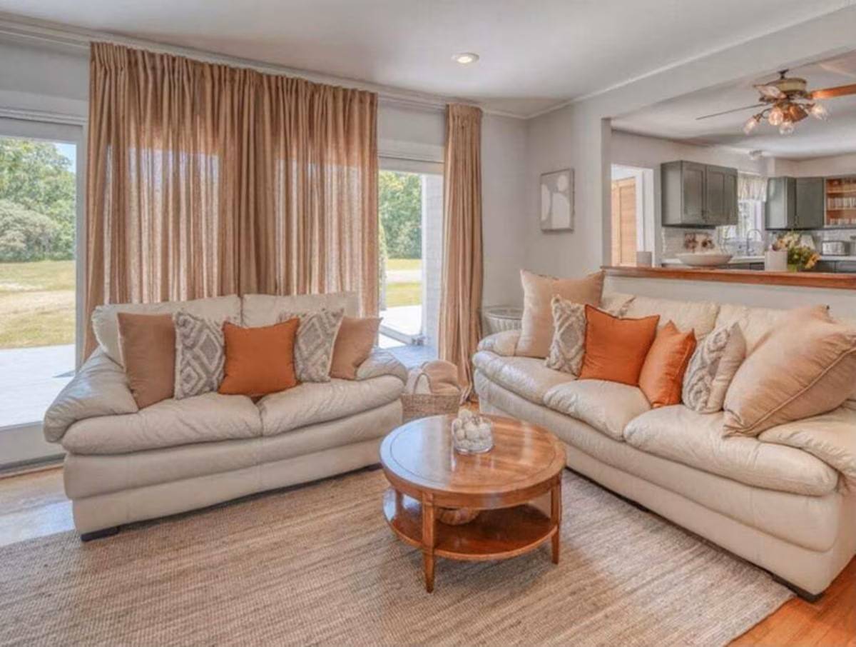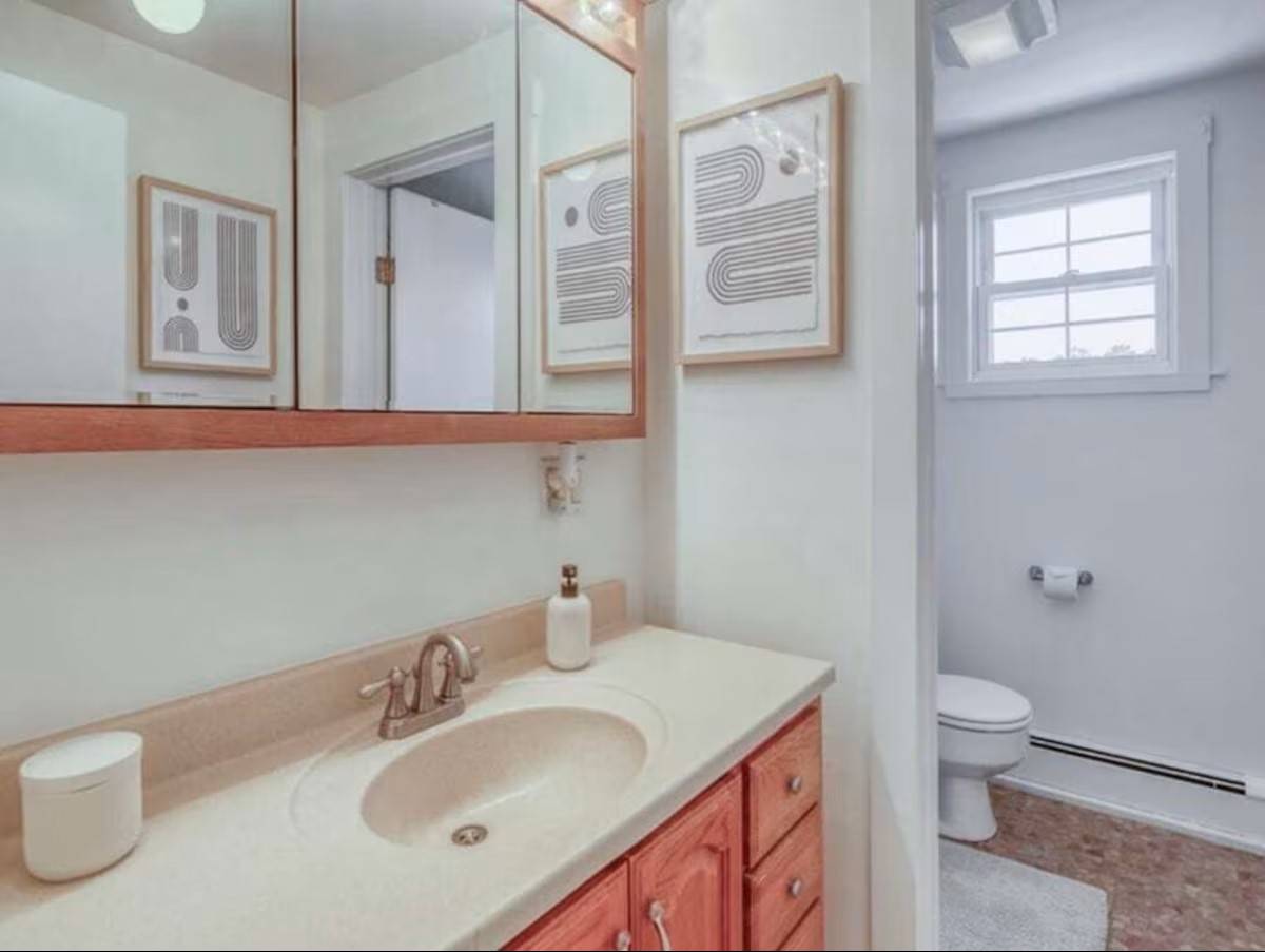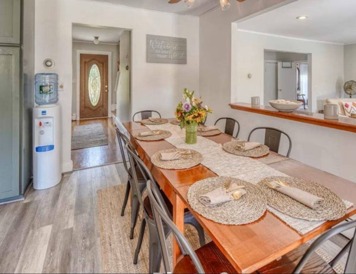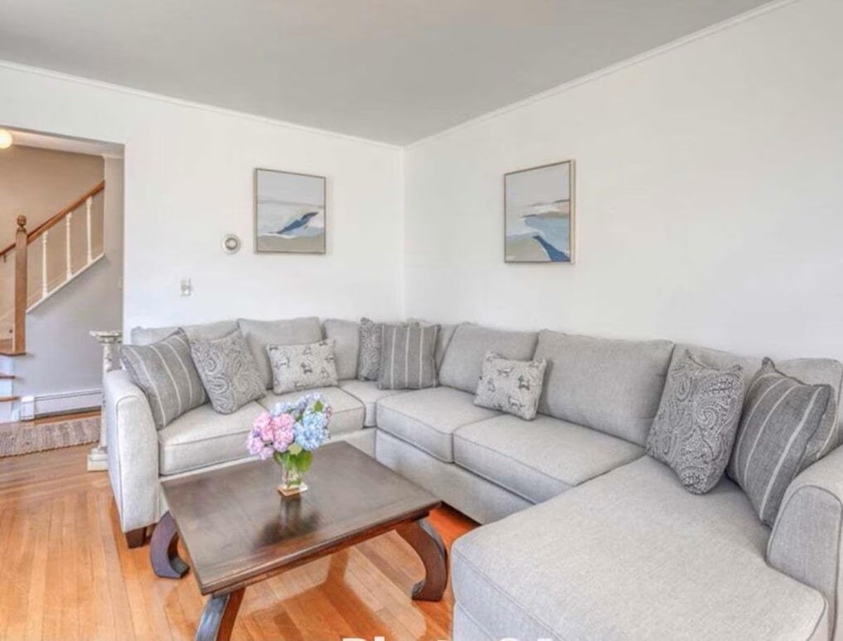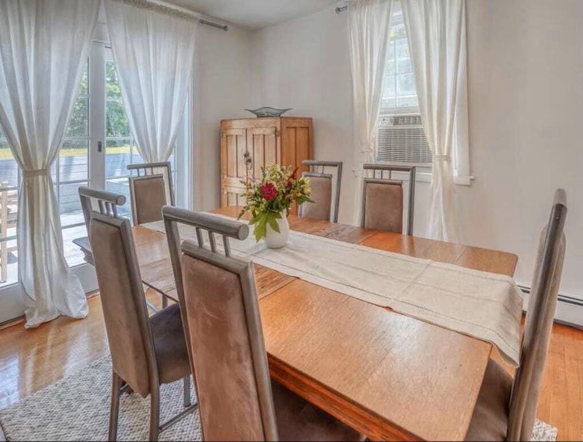The main level of our home offers a spacious eat-in kitchen with seating for 8. Off the kitchen, there is a more formal dining room with additional seating. Off the formal dining room, there is the living room which includes a quiet seating area, a large comfy sectional, and a desk perfect for office work. With no shortage of spots to sit and gather, the next space is our family room. Here we have a TV and sectional suitable for movie night! Off the family room is a half bath and a second work area with a desk.