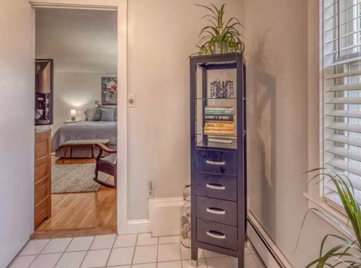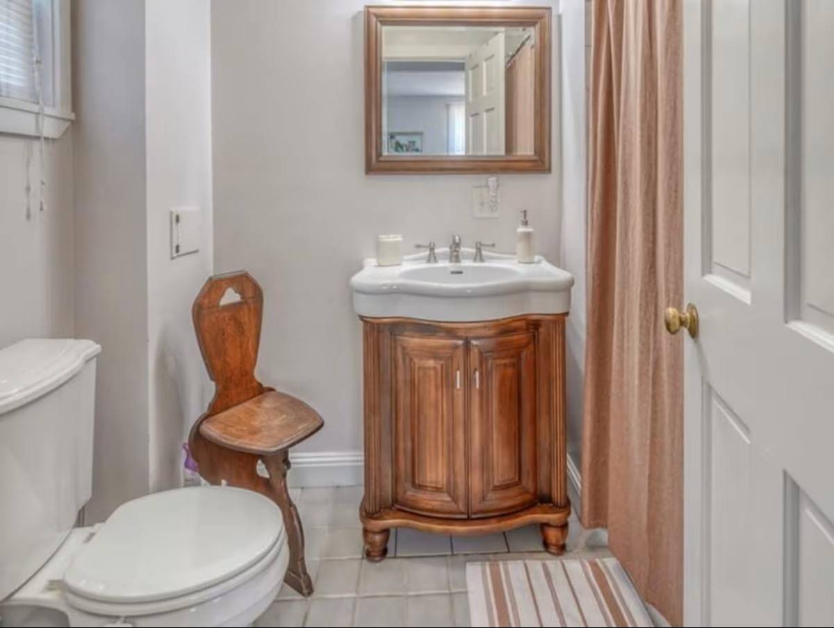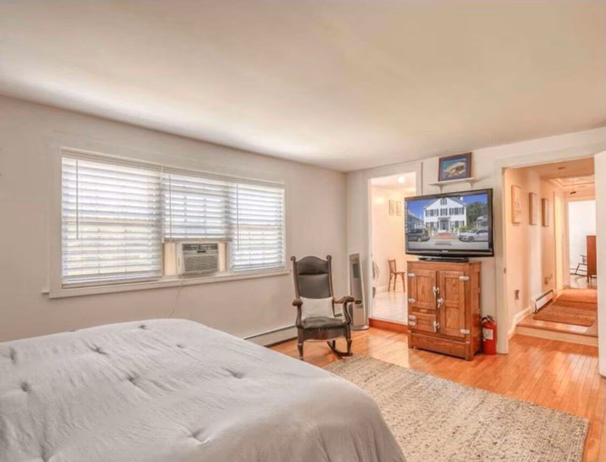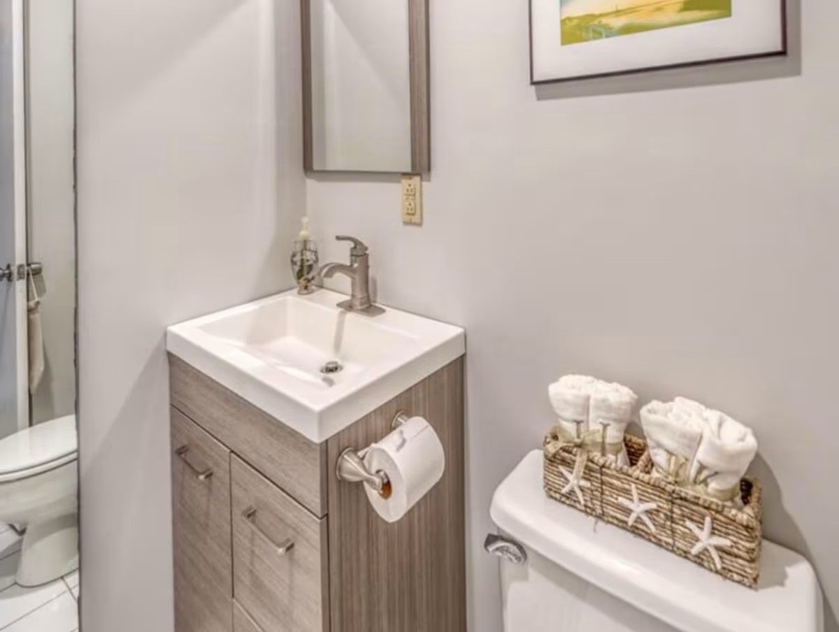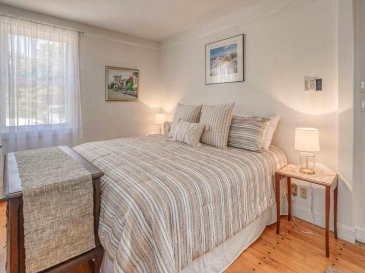 The main level of our home offers a spacious eat-in kitchen with seating for 8. Off the kitchen, there is a more formal dining room with additional seating. Off the formal dining room, there is the living room which includes a quiet seating area, a large comfy sectional, and a desk perfect for office work. With no shortage of spots to sit and gather, the next space is our family room. Here we have a TV and sectional suitable for movie night! Off the family room is a half bath and a second work area with a desk.