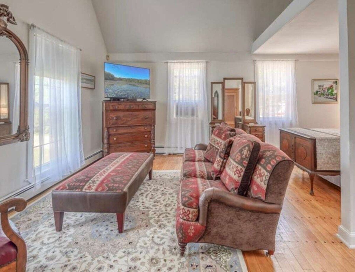 Primary Study w/ en suite is additionally on the main level with a king bed, TV, and a large sitting area.