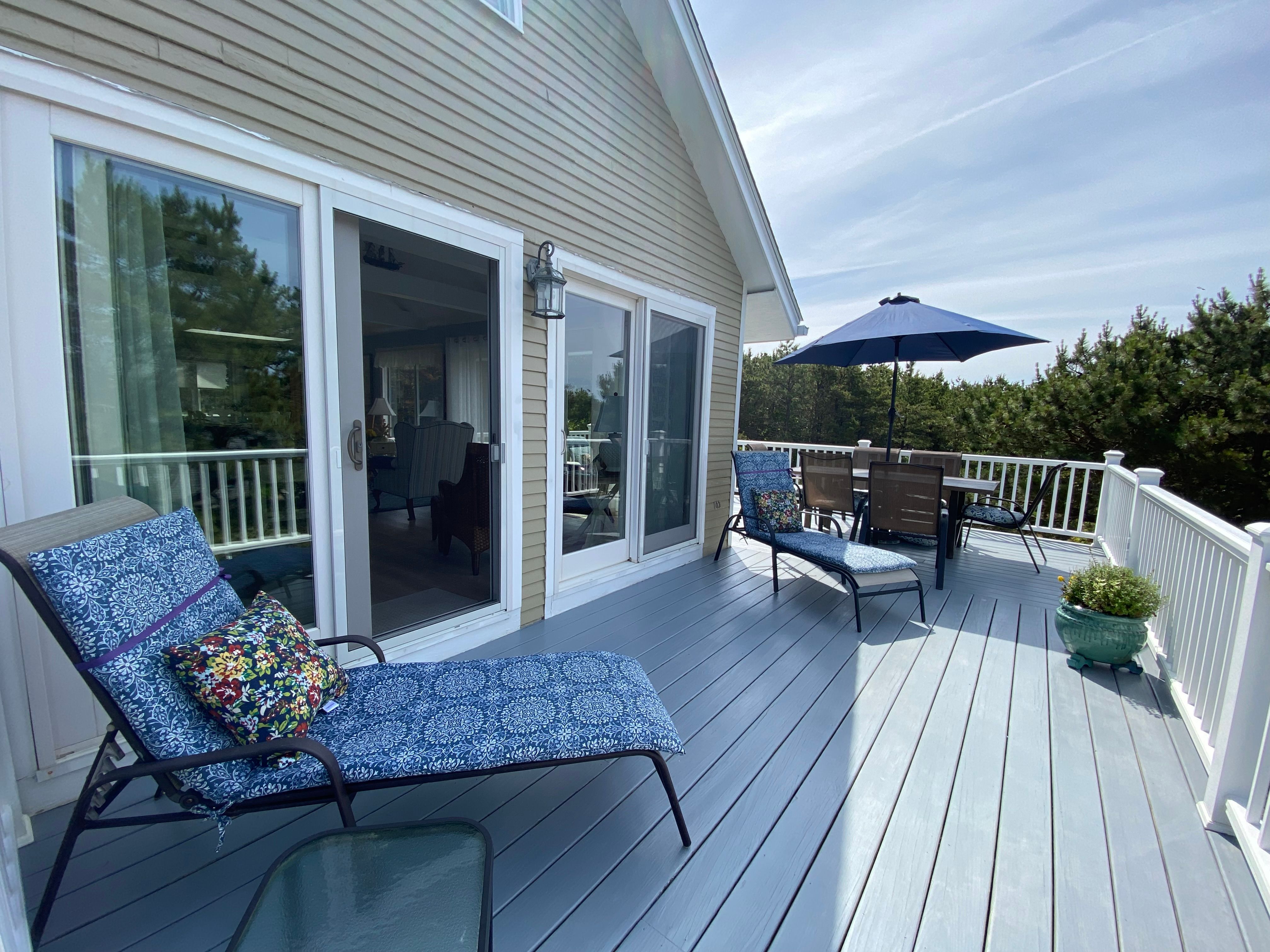 Wonderful, spacious, open & airy contemporary home set on the Wasque plains with great views of Katama Bay & the Atlantic Ocean (walk to both). Spacious kitchen with breakfast counter, cathedral ceilings, and skylights. Large screened porch, open decks. Adjoins acres of conservation land full of natural splendor. 300 yards to Bay beach and a bit farther to the ocean. A beautifully decorated home. Enjoy splendid sunsets, pristine beaches and shell-fishing! Comfortable electric heat. Edgartown, with its fine shops,restaurants, and galleries is minutes away by car and ferry. A true vacation setting!